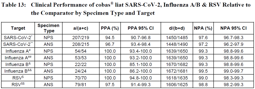 对于NPS标本,对SARS-CoV-2的PPA和NPA分别为94.5%和97.6%;对甲流的PPA和NPA分别为100.0%和99.3%;对乙流的PPA和NPA分别为100.0%和99.3%;对RSV的PPA和NPA分别为100.0%和99.0%。