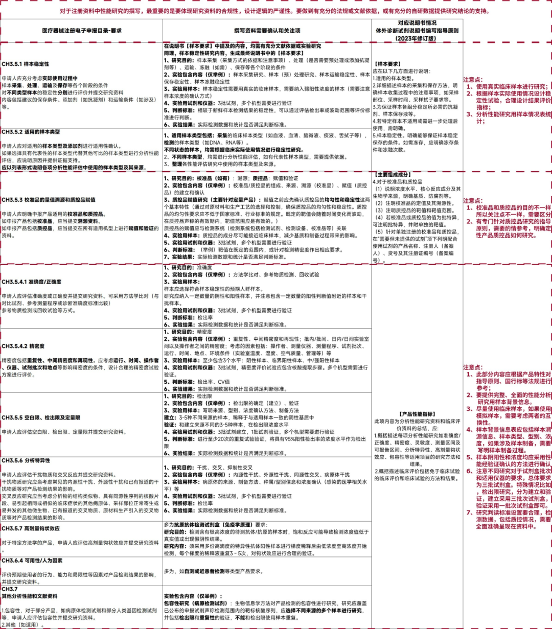 近期很有触动的一件事: 如何把话说清楚,越来越觉得 这是一个急需锻炼的能力。 其中有一种情况是:一个名词在不同的场景、不同的适用条件下,所代表的含义是不一样的。(在关于“设计开发”的理解上也是深有体会)。 今天想要和大家分享的内容是:注册资料中的分析性能研究。为什么要在分析性能的前面加一个注册资料的限定范围,是因为,在产品设计开发阶段就已经引入了“分析性能”的概念,把产品从研发转到生产,同样也有“分析性能”的概念,而我们今天所说的分析性能,不同于前两者,仅仅指的是在注册资料中的分析性能模块资料。 可能有的人会问,这几个阶段的分析性能有什么区别呢? 说一下我个人理解,我认为,是每个阶段对于分析性能的要求,或者说是目的,是不一样的。 是产品真正结合临床需求、市场情况、技术条件,综合进行评估,它更偏重于解决满足临床和市场需要以及发展技术上的优势等。应当根据产品预期用途和技术特征开展体外诊断试剂非临床研究。(引用“体外诊断试剂注册与备案管理办法 (2021-08-26)——第三章 体外诊断试剂注册——第一节 产品研制——第二十九条”) 研发人员把产品分析性能输出给生产质量之后,其实就变成了白纸黑字的“技术要求”,并且会在产品质量的控制过程中起着关键作用,在技术要求中的性能分析,考量又有所不同。 是在注册资料中体现出来的分析性能相关的要求,此部分的内容是基于设计开发阶段和转产阶段之后,综合而来的,是直接提交给审评老师进行产品注册申报的材料。以器械审评员的角度来看,了解这个产品的唯一途径,就是接收到的注册资料,而他们要做的事情,就是基于资料,保证获批产品的安全、有效。所以,对于产品的安全性和有效性的评估,是我们在这个阶段的分析性能研究中需要重点关注的地方。 今天我们称它为“注册资料中的分析性能研究资料”,既然是注册申报所用,所以必然根植于法规的要求。接下来,我也将从参考法规、资料入手角度、框架及整体要求、不同模块的侧重点四个方面进行分享。 01 参考法规 基于我们这次分享的分析性能还是围绕注册资料服务的,所以我们还是不能脱离了法规的指导,例行和大家屡一下涉及到注册资料性能评价要求的法规: ① 关于注册资料框架的法规: ② 个性化要求参考法规: 定性检测体外诊断试剂分析性能评估注册审查指导原则(2022年第36号) 定量检测体外诊断试剂分析性能评估注册审查指导原则(2022年第32号) 以及器审发布的针对产品的指导原则和相关行标。 02 资料撰写入手角度 ① 在确认注册资料提交范围时,可以依据注册资料申报要求法规进行整体资料目录的和内容框架的搭建; ② 在确认每份注册资料内容时,需要依据个性化的指导原则、国行标,进行实验的设计,并输出实验报告和数据,填充进我们之前的框架中,形成最终的注册资料。 03 框架以及文件内容整体要求 此环节的主要目的,是确认“注册电子申报目录”中“3.5分析性能研究”模块,针对申报产品的特性,需要提交哪些资料,以及每个资料必须提供的内容,形成针对不同子模块的模板文件。 此环节主要的依据法规为“122号文”和“医疗器械注册电子申报目录文件夹结构”,我将这两个法规对于“分析性能研究”模块的内容进行了对比,基本上内容一致,参考两个法规发布时间点,“电子申报目录”应该是以“122号文”为基础进行的细化。(如下图所示) 简单说明一下图示内容,以及图中隐藏内容的情况。图中最左侧一列,为两个法规(“122号文”和“注册电子申报目录”)对于分析性能研究的整体要求,右侧三列,为针对3.5章节中,包含的子模块内容以及其研究内容的相关要求。此次分享,按照电子申报目录内容,隐藏了CH3.5.8 测量区间及可报告区间、3.5.9 阳性判断值或参考区间、CH3.5.10反应体系以及3.6.5 试剂稳定性四个模块,因为阳性判断值研究、反应体系研究、主要原材料研究、试剂稳定性研究的考量逻辑以及内容,和其他的性能分析略有不同,并且会更倾向于在早期设计开发阶段进行研究,同时有的模块会有针对性的法规进行参考,后续会在设计开发-性能分析中再进行详细分享。 另外,针对性能评估的共性要求,在《定性检测体外诊断试剂分析性能评估注册审查指导原则》中有所提及,结合“122号文”性能评估通用要求,一起参考,形成资料的模板内容。(如下图所示) 根据以上共性的资料要求,我们可以归纳出每个模块资料的框架: 把整体的资料框架搭建起来之后,我们需要根据产品设计开发-分析性能评估的情况,进行后续内容的填充和丰富。 关于设计开发-分析性能评估和注册资料-分析性能评估,两者如文章开头提到,目的是不一样的,所以关注点和侧重点也会不一样。因此,在本文中,下一部分关于每个模块的分析性能分析,更侧重的是依据相关法规和指导原则,成系统的分析性能评估。实际需要结合产品的预期用途和技术特点进行特殊考量思路,后续会在设计开发-分析性能评估中再做详细学习。 04 不同模块分析性能实验的侧重点 依据“注册电子申报目录”和上述归纳的模块资料框架(下图第一列),列出在撰写注册资料时,需要考量的重点和体现的信息(下图第二列),同时列出和产品说明书的对应关系(下图第三列),如下图所示。 以上内容,从法规参考、到资料撰写