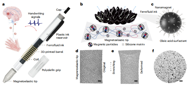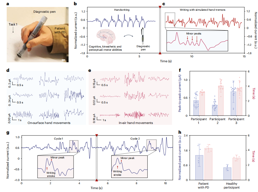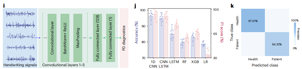 近日,杂志nature chemical engineering上发表了一篇题为“Neural network-assisted personalized handwriting analysis for Parkinson’s disease diagnostics”的文章。作者开发了一种具有磁弹性尖端和铁磁流体墨水的诊断笔,可将细微书写动作敏感地转换为高保真的传感信号,用于笔迹分析。为了证明其临床潜力,作者进行了一项初步人体研究。结果显示,诊断笔可准确记录笔迹信号,神经网络辅助分析这些手写信号成功地将PD患者与健康参与者区分,平均准确率为96.22%。总之,此研究表明,自供电诊断笔为PD的及时检测提供了一种潜在的低成本、广泛推广、可靠和可获取的策略。 图片来源:nature chemical engineering 诊断笔的设计及工作机制 书写是一个复杂的过程,它将认知、感知和精细运动能力交织在一起,分析笔迹模式可以为诊断PD提供重要的定量的生物特征标记。 诊断笔(图a)由磁弹性笔尖和铁磁流体墨水组成。磁弹性笔尖维持铁磁流体墨水内的磁化(图c);还会在外部机械应力(图d)下引起尖端变形(图e),从而导至其磁通量的变化。这种磁通变化,结合铁磁流体墨水在书写过程中的动态运动,在周围线圈中产生电压信号。实验结果证实,诊断笔的软笔尖的磁弹性效应和铁磁流体墨水的动态运动驱动,能够将手写运动症状转化为传感信号。 诊断笔的设计及工作机制。 图片来源:nature chemical engineering 手写到电信号的转换 为了评估手写到电信号的转换过程,作者首先研究了运动在不同水平加速度(图a)、水平频率(图b)、垂直加速度(图c)和垂直频率(图d)下产生的电流信号。该过程显示,随着加速度水平的升高,电流信号输出明显增加(图a和c)。不同频率的正弦波对电流信号输出也有影响,高频运动产生更强的输出信号(图b和d)。还研究了诊断笔捕捉高频书写动作的能力。结果表明,诊断笔可准确记录10-12 Hz范围内的高频运动(图e)。这些发现验证了诊断笔精确记录快速笔迹运动而没有明显延迟的能力,证实了其适合高频运动检测。 将笔迹转换成高保真传感信号。 图片来源:nature chemical engineering 个性化笔迹分析 作者探索其在临床场景中的潜力。与健康的参与者相比,PD患者通常表现为手部和手指的震颤和运动迟缓。手颤抖被记录为额外的小峰(图c),将其与正常笔迹的模式区分开来。 作者给参与者的3个任务分别为连续波浪线、连续螺旋和书写“MEGPEN”。对于健康参与者的代表性电流信号如图d和e所示。而PD患者的书写信号出现了额外的小峰(图g)。作者提取了笔迹参数,并计算了归一化峰值电流值和每个周期的书写持续时间(图h)。结果显示,PD患者的信号峰值电流为1.33±0.40(a.u),书写持续时间为4.28±0.35 s,而健康参与者的信号峰值电流为0.67±0.11 (a.u),书写时间为2.97±0.27 s。这些观察结果为诊断笔在临床相关应用场景中准确捕捉笔迹运动的潜力提供了支持。 神经网络辅助个性化手写分析PD诊断与试点人体研究。 图片来源:nature chemical engineering 神经网络辅助PD诊断 最后,作者实施了一项神经网络辅助分析,以区分PD患者和健康人的笔迹信号(图i)。评估了三种基于神经网络的模型,包括一维卷积神经网络(1D CNN)、1D CNN与LSTM、 LSTM,以及三种传统的机器学习方法(随机森林、XGBoost和逻辑回归)。综合性能指标,包括准确性、精密度、召回率和F1分数,在所有模型中进行了比较(图j)。 结果表明,1D CNN模型具有最佳的准确率(0.9622)和F1分数(0.9266),健康参与者的召回率为0.9795,精度为0.9701,而PD召回率为0.9150,精度为0.9432,这意味着很少假阴性,也很少假阳性(图k)。这些结果表明,诊断笔与神经网络驱动的笔迹分析管道相结合,具有有效诊断帕金森病的潜力。 神经网络辅助PD诊断。图片来源:nature chemical engineering 总结与讨论 作者开发了一种具有磁弹性尖端和铁磁流体墨水的诊断笔,可将细微书写动作敏感地转换为高保真的传感信号,用于自供电笔迹分析。为了证明其临床潜力,作者进行了一项初步人体研究。结果显示,诊断笔可准确记录笔迹信号,神经网络辅助分析这些手写信号成功地将PD患者与健康参与者区分,平均准确率为96.22%。总之,此研究表明,自供电诊断笔为PD的及时检测提供了一种潜在的低成本、广泛推广、可靠和可获取的策略。 此研究的局限性在于有限样本量的初步人体研究。未来的研究可能涉及更多样化的PD患者队列,样本量更大,以进一步验证诊断笔生成的手写信号作为数字标志物,并根据适当的临床标准进行验证,以确保临床相关性。未来的工作可能还涉及已知和不同疾病分期的PD患者,以进一步研究诊断笔在分期评估和跟踪疾病进展方面的潜力。总之,这种诊断笔技术可以提供一种创新的途径补充现有的PD诊断方法,促进在大量人群中进行早期检测。对于那些尚未认识到自己是潜在PD患者的未经治疗的个体,以及那些在资源有限的地区,使用化学生物标志物进行医学诊断的机会很少的人来说,这尤其有益。 |