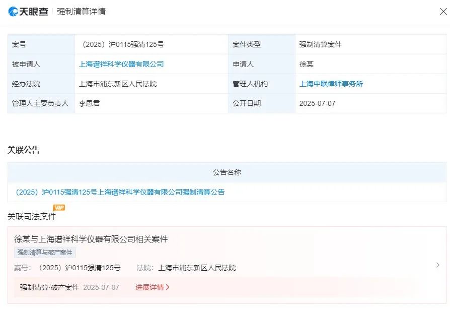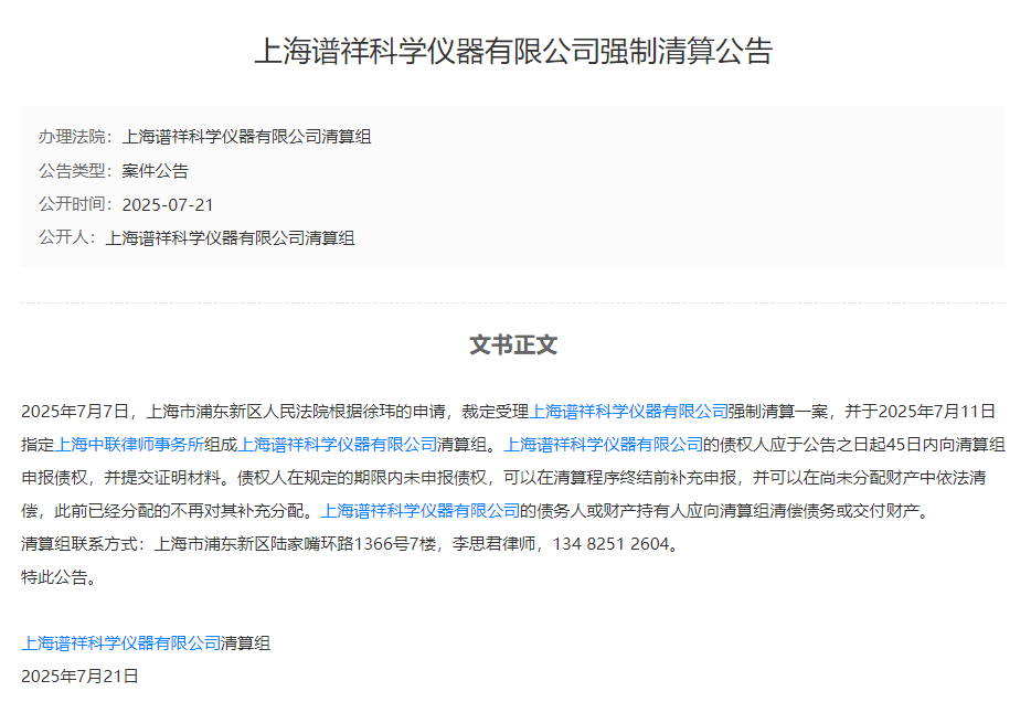 近日,生命科学产业观察编辑凯莉从天眼查得知,上海谱祥科学仪器有限公司有被申请强制清算的案件信息。 2025年7月7日,上海市浦东新区人民法院一则裁定,让上海谱祥科学仪器有限公司进入大众视野,法院受理了其强制清算一案,并于4日后指定上海中联律师事务所组成清算组。这家成立于2014年10月27日、注册资本200万元的公司,在历经11年风雨后,走向破产清算,不禁令人唏嘘。 上海谱祥科学仪器有限公司,从公开资料来看,曾是一家专业的实验室仪器设备供应商,官网称其与安捷伦科技(Agilent Technologies)、赛默飞世尔科技(Thermo Fisher Scientific)等世界一流仪器制造商有着密切广泛的合作,业务覆盖分光光度计、液相色谱仪、酶标仪、气相色谱系统、光谱仪等多种产品,致力于为国内高校、科研院所及企业单位提供实验设备、解决方案、技术支持和售后服务。然而,就是这样一家在色谱领域有着一定布局的企业,如今却陷入破产困境。 上海谱祥科学仪器有限公司的破产清算,不仅是一家企业的落幕,更是生命科学产业在变革浪潮中的一个缩影。它警示着行业内的其他企业,在复杂多变的市场环境中,必须紧跟政策导向,加大技术创新投入,优化成本结构,提升自身核心竞争力,才能在激烈的市场竞争中求得生存与发展。同时,也为行业观察人士提供了一个深入剖析企业兴衰与行业发展关系的样本,促使大家进一步思考在产业变革期,企业应如何找准定位,实现可持续发展。 |