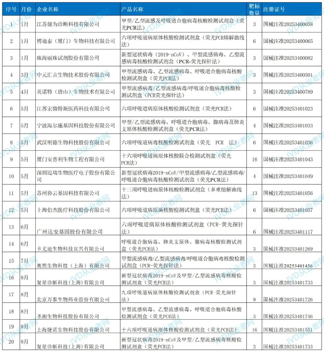 一、多联检产品数量爆发,呼吸道领域领跑从产品分布来看,呼吸道病原体检测仍是多联检的主战场。在43款已获证产品中,呼吸道板块独占20款,占比近半。其中既有传统的3联检(如甲流/乙流/呼吸道合胞病毒),也有覆盖16种病原体的超高通量产品(如厦门安普利、上海捷诺的16联检试剂盒)。 这类产品之所以备受青睐,源于呼吸道感染病原体多样、症状相似、临床鉴别诊断难度大。多联检试剂盒可在一次反应中完成多种病原体的筛查,极大提升了检测效率与诊断准确性。 二、技术路径多元,荧光PCR仍为主流从技术平台看,荧光PCR法仍是绝对主流,尤其是结合熔解曲线法、多重PCR等技术,实现了在同一反应体系中区分多个靶标。例如苏州协云基因的“十三项呼吸道病原体核酸检测试剂盒(多重熔解曲线法)”,正是通过熔解温度差异实现多靶标区分,体现了技术融合的优势。 此外,数字PCR、恒温扩增等新技术也开始在细菌真菌等领域试水,如领航基因的鲍曼不动杆菌等四联检产品就采用了数字PCR法,提升了检测的灵敏度和定量能力。 三、应用场景拓展,从呼吸道到全身感染除呼吸道外,多联检产品在胃肠道、性病、中枢神经感染、真菌鉴定等领域的应用也日益广泛。例如: