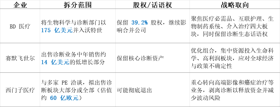 分拆细节与差异 三家巨头的不同路径 BD、赛默飞和西门子拆分细节: BD医疗(Becton Dickinson) BD保留部分股权,确保在合并后仍具影响力,同时释放资源聚焦高增长板块(医疗必需品、互联护理、生物制药系统、介入治疗)。 而中国区的业绩压力是其重要考量维度。中国区的下滑影响已成为拖累BD医疗生命科学业务的重要因素之一,同样标本管理产品在中国的销量表现不佳,药物输注相关产品也受到中国集采政策的持续冲击。 赛默飞世尔 剥离范围:计划以约 40亿美元 出售诊断部门年销售额约 14亿美元 的部分业务,约占其专业诊断部门三分之一,包括生产传染病检测设备的微生物学部门。 进程状态:已聘请顾问、启动试探性拍卖,但最终出售尚未板上钉钉,可能最终选择保留。 特点:选择部分剥离,而非完全退出,体现其对诊断业务仍有保留判断。 西门子医疗 交易规模:与多家头部PE初步磋商,出售诊断业务估值或超 60亿欧元(约500亿元人民币)。 资本操作背景:此前出售母公司2%股份筹集 14.5亿欧元,显示集团正通过资产处置加速战略转型。 特点:诊断业务在西门子体系内不再被视为增长引擎,分拆是向高端影像与先进治疗倾斜的第一步。 差异总结: