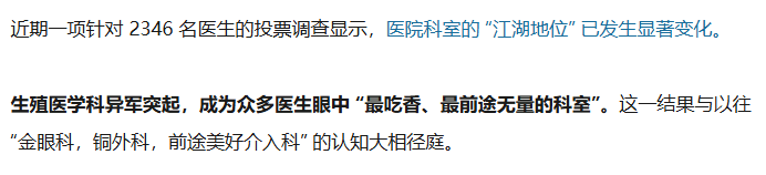 | 随着全球经济寒冬的发生,这两年,医生的日子变得越来越难过。降薪、欠薪、停薪甚至因为医院倒闭,导至医生失业的情况也屡见不鲜。医疗行业“寒冬”降临的消息不绝于耳。诊疗量和手术量“双降”已成为许多医院面临的残酷现实。 有医院走廊空荡,候诊区只有零星几个人,专家号当天就能挂到。然而,在这片寒冬景象中,当一些曾经的明星科室为发不出绩效而苦恼时,另一些以往不起眼的科室却悄然崛起,成为医院收入的中流砥柱。根据国家统计局发布的《中国统计年鉴2024》,2023年,我国总人口为14.097亿,其中65岁以上老人占比15.4%,共有2.17亿人。虽然根据联合国标准,15.4%的老年人口占比已经到达了中度老龄化的标准,但总抚养比仅为46.5%,属于一个相当健康的比例。此外,我国的老年人口占比跟日本、意大利那些真正老龄化问题特别严重,老年人口超25%甚至逼近30%的国家相比,不管是比例数值还是比例增长速度,都不算严重。然而,在我国14亿人的人口基数下,老年人口占比问题不算严重,不等于实际的老年人口存在的健康问题就小了。毕竟65岁以上老人有足足2.17亿人。而人类,随着年龄的增长,器官功能会衰退、细胞修复能力会减弱,同时基础疾病会累计变多,对病原体和外界刺激的抵抗力也会降低。年龄越大越难出现完全健康的人,即便是自然衰老也可能给某些个体带来疾病。在如此庞大的老年人口下,老年病科、门诊慢性病等相关科室的就诊需求是不可能随着经济环境的变化而出现下降,而只会是稳定的逐年增加。基于这不可避免的人口趋势与社会现实,我们正在大力发展老年医学。2025年4月28日,国家卫健委发布了《国家卫生健康委办公厅关于印发老年医学科建设与管理指南(2025年版)的通知》。国家卫健委在通知中表示:按照党中央、国务院决策部署,为指导规范老年医学科建设与管理,推动完善老年人健康支撑体系,提升老年医学医疗服务能力,满足老年人医疗服务需求,我委于2019年制定印发《老年医学科建设与管理指南(试行)》。在总结老年医学科建设管理经验基础上,我们修订形成《老年医学科建设与管理指南(2025年版)》。此外,去年,2024年10月,国家卫生健康委下发了《关于提升老年医学医疗服务能力的通知》,提出“到2027年末,力争二级以上综合医院规范设置老年医学科的比例达到80%。”据媒体报道,截至2024年3月,全国设有老年医学科的二级及以上综合性医院占比超过 62%,提前完成到2025年60%的目标。此外,国家卫健委还明文规定,要为老年医学科医护人员提供必需的工作、学习条件,关心关爱医护人员,合理确定老年医学科医护人员薪酬水平,充分调动医护人员积极性,形成稳定的老年医学科医护团队。最近10年,随着短视频、直播与互联网经济的爆火,在网上“出镜”成为了很多人的赚钱渠道。的确,有非常多的手艺人靠着自己精湛的作品出圈,赶上了这一波互联网的浪潮。但也有相当一部分人由于种种原因,无法产出令自己满意的劳动作品,于是选择了露面,想看看自己的样貌能不能有路人缘,从而抓住互联网带来的机遇。因而,在现在这个互联网时代下,有面对公众这一需求的人越来越多,皮肤科和整形外科也越来越受到他们的重视。毕竟,即便不打算整容的公众人物也难免对皮肤管理有着一定的需求。皮肤科自费项目多,门诊为主。多数医院没有住院,甚至部分医院的皮肤科没有夜班,工作强度相对不大。而整形外科虽然要手术,但国内正规医院的整形外科在美容需求上进行的手术大多患者自费、难度不大,相对的手术风险也不大,且术前医患双方有充足的时间进行沟通,医患纠纷风险相对较小。至于需要整形外科进行的正畸类手术因为是患者刚需,它并不会因为美容患者人数的增多而出现下降,因而不论是皮肤科亦或者是整形外科,在这个人们寻求多元化发展的时代,只会发展得越来越好。虽然最近这些年的大趋势是年轻人越来越不愿意生了,妇科、产科、儿科越来越难做了,但令很多人没想到的是,生殖医学相关科室在这股“拒生潮”中异军突起了。在近期一项调查中,生殖医学科被评为医生心中“最吃香、最前途无量的科室”。 这一结果相当出人意料,毕竟在过去很多年中,“金眼科,铜外科,前途美好介入科”才是医生们的共识。当然生殖医学能看似逆时代潮流,甚至在与其他类型科室的pk中拔得头筹,原因是多方面的。首先是其业务范围广泛,治疗费用普遍较高且大多不在医保报销范畴,强大的创收能力为科室发展提供了坚实的经济基础。其次,一个反直觉的事情是,在不想生的大环境下,会求助于生殖医学的患者人数不降反增。的确,目前新生儿相对于夫妻的比例是越来越小了。但这个比例的下降并非是全都不生了,很多人的选择是延后生育时间,不少人甚至是延后10年乃至20年。延后生育时间的结果自然是生育能力的下降。原本在生育能力巅峰时期,无需生殖医学辅助就能拥有孩子。延后数年导至生育能力自然衰退,此时再想繁衍自然必须借助生殖医学的力量。前往生殖医学科进行问诊的人自然也就多了起来。当然,有鉴于生殖医学的费用问题,会主动前往该科室就诊的患者,多为高收入高学历的不孕不育人群。这一类患者沟通相对容易、医患纷争风险值低,门诊环境舒适安静,且通常无病房和急诊任务。医生工作压力小,加班和值夜班频率