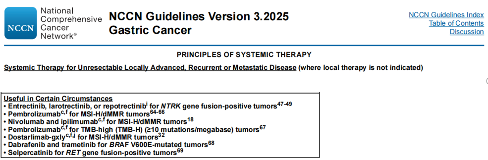 胃癌是起源于胃黏膜上皮细胞的恶性肿瘤,根据国家癌症中心2022年数据,新发结胃癌病例为38.57万例,新发病例排名第五位;死亡病例为26.04万,死亡病例排名第三位,仅次于肺癌、肝癌。2010年,FDA批准曲妥珠单抗联合化疗用于HER2阳性转移性胃癌的一线治疗,开启了胃癌精准治疗的新篇章,随后十多年,围绕HER2阳性、PD-L1表达的研究陆续出现积极的结果,纷纷获批;2024年,FDA&NMPA批准佐妥昔单抗用于联合化疗用于CLDN18.2阳性、人表皮生长因子受体2(HER2)阴性的局部晚期不可切除或转移性胃或胃食管交界处(GEJ)腺癌患者的一线治疗,将胃癌精准治疗推上了新的高度。 今天,我们就聊聊胃癌基因检测的相关内容,希望可以帮助有需要的朋友。如有疑问,欢迎文末添加微信交流。HER2不同表达状态下治疗:在胃癌中,HER2表达状态是胃癌精准治疗体系中重要的界标,包括HER2高表达、HER2中低表达及HER2不表达,HER2表达状态结果判断我们在乳腺癌曾经讲过(戳:乳腺癌基因检测“刚需”进化之路),本篇就不再赘述。HER2高表达靶向治疗:2010年ToGA研究在HER2阳性晚期胃癌中获得成功,首次将晚期胃癌患者OS延长至一年以上,开启胃癌抗HER2治疗时代,FDA及NMPA也相继批准曲妥珠单抗联合化疗用于HER2阳性晚期胃癌的标准一线(二线)治疗方案。而后在多项临床试验中表明,维迪西妥单抗和德曲妥珠单抗在HER2高表达的胃癌三线治疗中有相对较好的结果,因此NMPA也批准了维迪西妥单抗和德曲妥珠单抗用于HER2高表达(维迪西妥单抗增加中表达)晚期转移性胃或胃食管结合部胃癌患者。HER高表达靶向联合免疫治疗:随着免疫治疗在肿瘤治疗中的爆火,抗HER2靶向治疗联合免疫治疗为胃癌治疗提供了新的方向;基于KEYNOTE-811研究,2021年,FDA加速批准了帕博丽珠单抗联合曲妥珠单抗和化疗用于HER2阳性不可切除局部晚期/转移性胃或胃食管结合部胃癌患者的一线治疗;2023年,FDA根据KEYNOTE-811最新数据将上述适应症调整为PD-L1表达CPS≥1的患者。 HER2中低或不表达免疫治疗:在HER2中低或不表达时,优先建议进行PD-L1检测,在CPS≥5时,CSCO指南推荐选择免疫联合化疗的治疗方案进行治疗。HER2中低表达或不表达佐妥昔单抗治疗:Claudin 18.2在各类癌症中广泛表达,包括胃癌、食管癌和胰腺癌等,目前已被证实是胃癌的新兴靶点。基于SPOTLIGHT&GLOW两项临床试验结果,FDA/NMPA相继批准佐妥昔单抗联合化疗用于一线治疗HER2阴性且Claudin 18.2表达阳性局部晚期不可切除或转移性胃或胃食管结合部腺癌患者。因此,CSCO/NCCN指南均推荐所有经病例诊断证实为胃癌的病例均有必要进行HER2、PD-1/PD-L1及Claudin 18.2检测。微卫星不稳定(MSI)免疫治疗:MSI作为胃癌独立的标志物,其状态与胃癌的免疫治疗相关,研究表明,与结直肠癌一样,多项临床试验表明,MSI-H/dMMR的胃癌患者可能从免疫治疗中获益,FDA/NMPA/CSCO指南等已批准多款药物用于治疗MSI-H的胃癌患者。同时,对于MSI-H/dMMR的围术期胃癌患者,CSCO指南推荐PD-1单抗联合CTLA-4或化疗进行新辅助治疗。泛靶点治疗:除了上述基因检测外,越来越多的泛靶点药物被获批,因此相应的泛靶点标志物也被NCCN/CSCO指南纳入到胃癌的基因检测中,如针对NTRK融合的拉罗替尼、恩曲替尼、瑞普替尼、针对 TMB-H 的帕博丽珠单抗、针对BRAF V600E 突变的达拉非尼联合曲美替尼以及针对RET融合的赛普替尼。与结直肠癌、甲状腺癌等一样,约有5%-10%的胃癌存在家族聚集现象,3%-5%存在遗传倾向。遗传性胃癌主要包含遗传性弥漫型胃癌(HDGC)、胃腺癌伴近端多发息肉(GAPPS)及家族性肠型胃癌(FIGC)三种。研究表明,遗传性弥漫型胃癌主要与CDH1胚系突变失活引起,小部分与CTNNA1、PALB2或RAD51C突变相关;有报道表明,胃腺癌伴近端多发息肉常与APC基因1B区突变相关。因此,胃癌高通量测序临床应用中国专家共识对考虑遗传性胃癌的患者或具有胃癌家族史的个体,推荐使用 NGS 进行遗传性肿瘤相关基因筛查,并做到具体的遗传咨询。以上就是胃癌基因检测的所有内容,我们欣喜的看到越来越多的靶点用于胃癌的治疗当中,从2010年的针对HER2高表达的曲妥珠单抗、PD-L1表达的免疫治疗、2024年针对Claudin 18.2的佐妥昔单抗、MSI的免疫治疗到泛靶点(NTRK融合、TMB-H、BRAF V600E及RET融合)的获批,为胃癌患者提供了更多的治疗方案,胃癌的精准治疗带来了前所未有的发展。相信随着医学的发展和检测技术的提高,胃癌的治疗会得到进一步的改善。胃癌Claudin18.2临床检测专家共识(2025版)