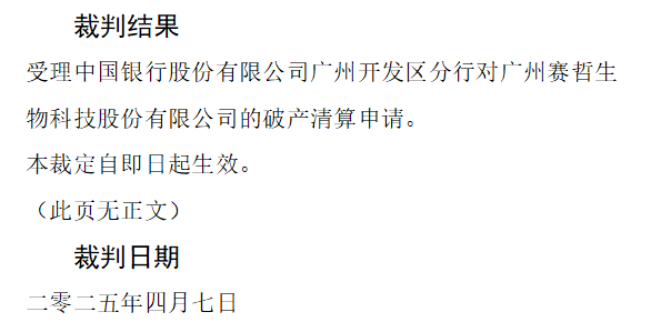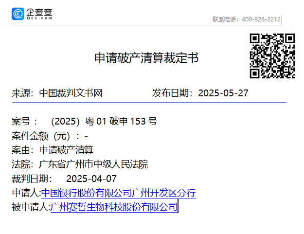 据中国裁判文书网显示,中国银行已经对广州赛哲生物的《申请破产清算裁定书》,据裁定书显示,赛哲生物经强制执行,无法清偿到期债务,已具备破产原因。中国银行广州开发区分行作为债权人申请对赛哲公司进行破产清算,其申请符合法律规定,广东省广州市中级人民法院已经受理此次破产清算申请。