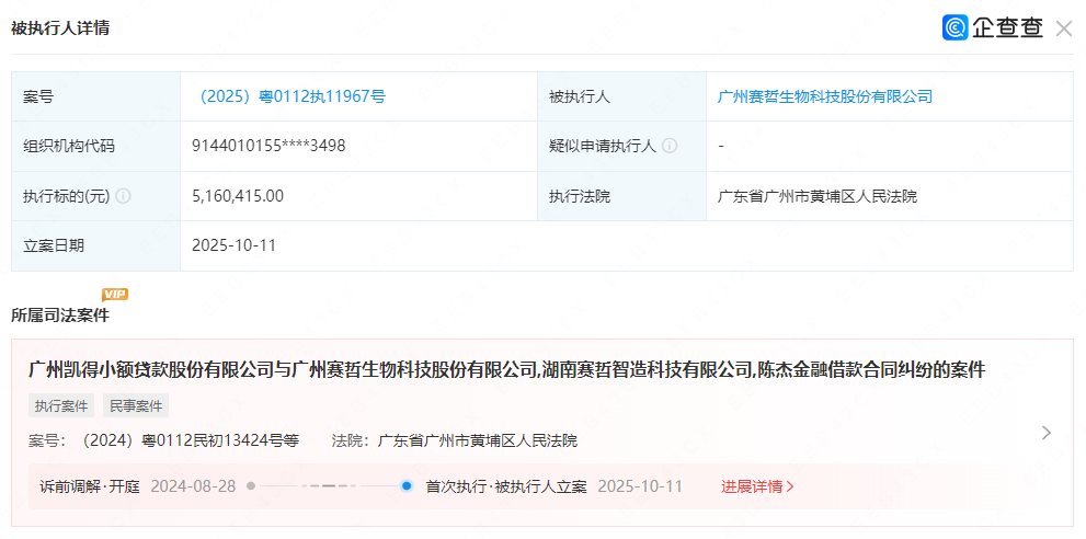 10月11日,9年前新三板上市的IVD明星企业——广州赛哲生物又双叒叕新增了一条被执行信息,执行标的516万!