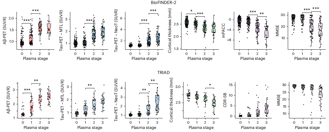 作者评估了模型血浆分期与AD关键标志物之间的关系,包括中颞叶(MTL)和颞叶新皮层(NeoT)区域的不溶性Aβ聚集体(Aβ- PET),不溶性tau聚集体(tau-PET),神经变性(皮质厚度)和认知表现。模型在BioFINDER-2和TRIAD队列中,观察到AD病理生物标志物在不同血浆分期的变化模式一致,且与PET分期(AA标准)高度吻合,支持了模型的有效性(见下图)。在两个队列中,‌Aβ-PET在血浆分期0→1显著升高,2期进一步升高,在3期后趋于稳定。‌tau-PET内侧颞叶(MTL)和新皮质(NeoT)摄取随分期1→3逐步增加。皮质厚度和认知表现也随血浆分期存在显著变化。