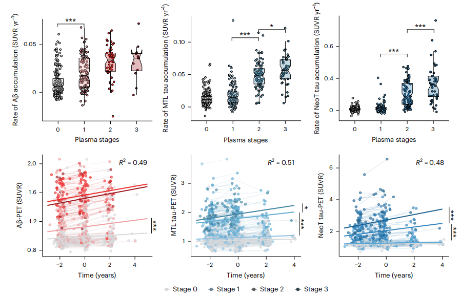 作者进一步研究了血浆tau分期是否与纵向MTL和NeoT区域Aβ-PET和tau-PET摄取(如下图),以及皮质厚度和认知能力下降有关。结果显示,2期患者的信号tau-PET在两个感兴趣区域的升高明显快于1期患者,3期个体tau-PET信号的增加速度高于2期个体。皮质厚度的下降率在不同血浆分期之间有显著差异,1→3期的皮质厚度年均减少0.19mm。使用mPACC和MMSE评分评估的纵向认知能力下降表明,血浆分期越高,认知能力下降的速度越快。