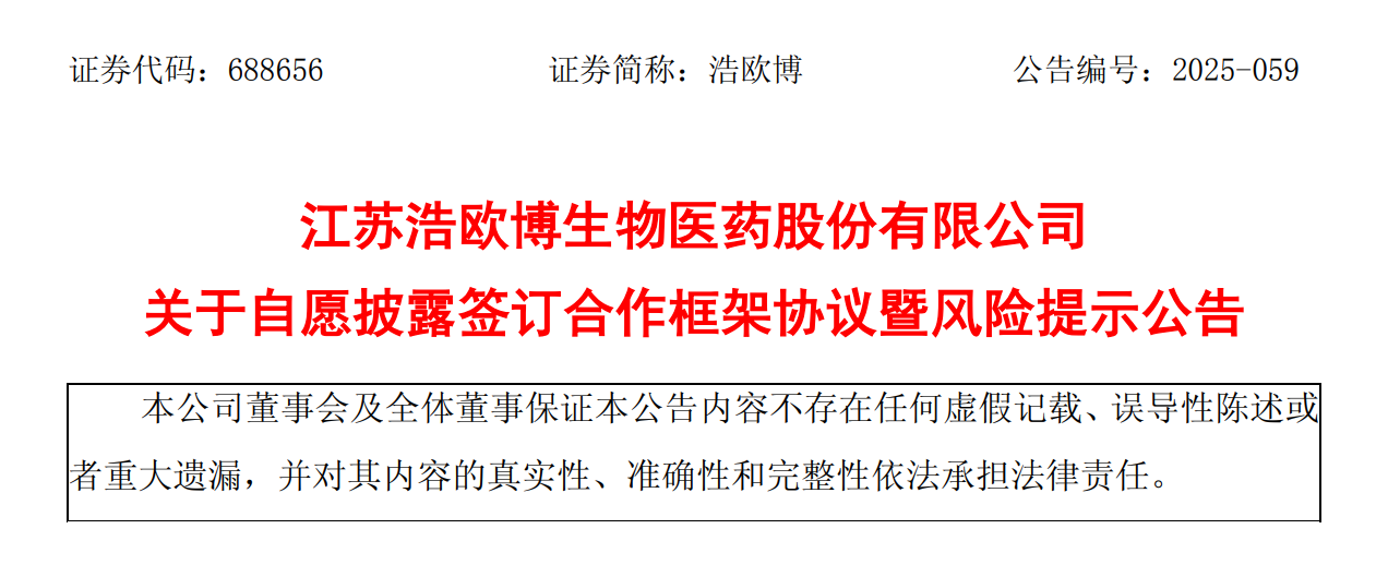 刚刚,江苏浩欧博生物医药股份有限公司发布《关于自愿披露签订合作框架协议暨风险提示公告》,江苏浩欧博生物医药股份有限公司与罗氏诊断产品(上海)有限公司签署《合作框架协议》,双方就化学发光自身抗体检测产品领域开展合作。 浩欧博与罗氏诊断于2025年10月21日在苏州市签署《合作框架协议》,双方就化学发光自身抗体检测产品领域开展合作。本协议为框架协议,不涉及具体金额,是双方相互合作项目的基础和指导性文件。本次签订《合作框架协议》事项无需董事会及股东大会审议批准,不构成关联交易及《上市公司重大资产重组管理办法》中规定的重大资产重组。 本次协议主要内容为:罗氏诊断向浩欧博直接采购化学发光自身抗体检测产品,并通过罗氏诊断自身的商业化能力在中华人民共和国境内(不含香港、台湾、澳门)区域进行商业推广。 本协议项下的合作期为5年,即自本协议生效之日起开始计算。合作期满,除非双方一致书面同意续展有效期,否则将自动终止。若本协议合作期满后不再续期的不影响已正式合作的具体合作项目的继续开展。 |
