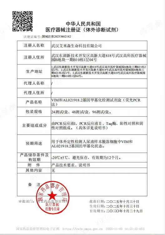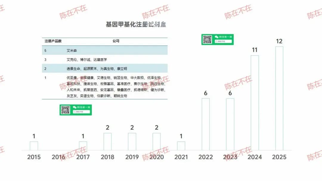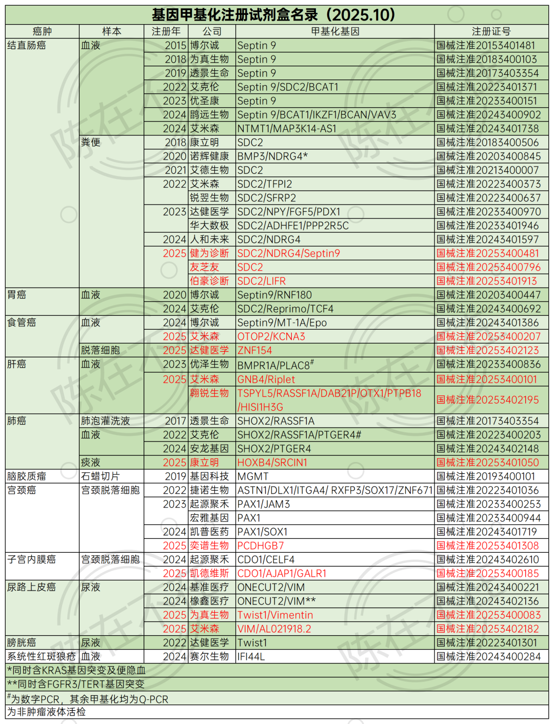 根据最新消息,艾米森公司新获尿路上皮癌甲基化试剂盒,双基因:VIM和新发现未命名的一个新基因,AL021918.2。翱锐生物新获6基因肝癌甲基化试剂盒。 至此,2025年甲基化新批证12个。 合计44张证,涉及到30家公司。 武汉艾米森获证5个,加上凯普的宫颈癌,合计6个,一骑绝尘! 艾克伦,博尔诚,达健医学3证紧随其后。 43个证与肿瘤相关。 另外1个为系统性红斑狼疮。 肠癌证以17张遥遥领先,其中血液7个,粪便10个 其次为宫颈癌,5张。 尿路上皮癌和肺癌,4张。 甲基化检测,1个数字PCR,其余均为Q-PCR 有两个试剂盒含基因突变 还有1个试剂盒含大便隐血 收费及医保,本次无更新 以上数据,截止到2025年10月31日。 |
