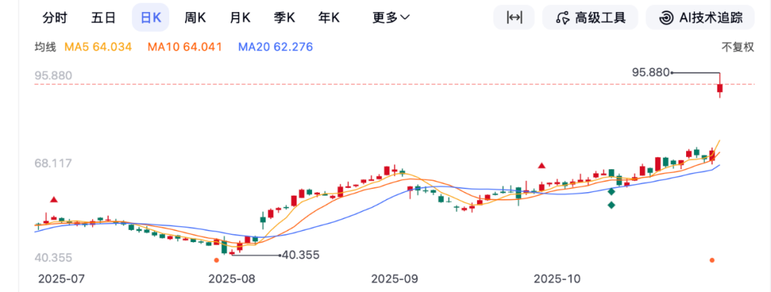 这是Guardant Health最近三个月的股价变化——从7月31日的40.98,变成了10月31日的92.41。