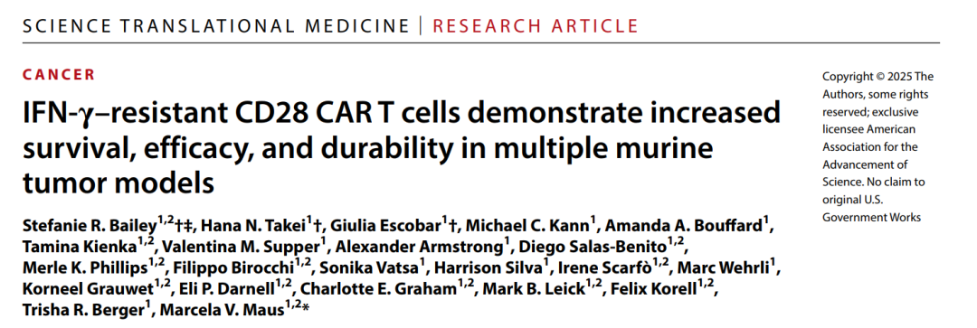 内容概览 近日,国际顶尖期刊《科学》旗下权威医学期刊《科学·转化医学》发表了一项具有里程碑意义的CAR-T细胞疗法研究。该研究由麻省总医院癌症中心细胞免疫治疗项目的Marcela V. Maus教授领衔,Stefanie R. Bailey博士与Hana N. Takei博士作为共同第一作者,联合多个顶尖团队共同完成。 研究团队通过创新性地敲除CAR-T细胞中的干扰素-γ受体,成功打造出新一代“IFN-γ抵抗型”CAR-T细胞。这种细胞在白血病、淋巴瘤、胰腺癌及三阴性乳腺癌等多种小鼠模型中,均表现出更强的扩增能力、持久性和肿瘤清除效果,甚至能建立长期免疫记忆,有效防止肿瘤复发。 研究背景 嵌合抗原受体(CAR)T细胞已彻底改变了血液恶性肿瘤患者的治疗格局,近期更有多款CAR-T疗法获批用于治疗B细胞淋巴瘤、B细胞白血病和多发性骨髓瘤。然而,该领域面临的临床挑战之一是复发问题,其发生主要源于肿瘤的抗原逃逸或CAR-T细胞植入与持久性不足。干扰素-γ(IFN-γ)是一种主要由T细胞和自然杀伤(NK)细胞释放的促炎细胞因子,在癌症中扮演复杂且有时相互矛盾的角色。最近研究证明,在血液肿瘤模型中,嵌合抗原受体(CAR)T细胞产生IFN-γ并非其发挥疗效所必需;而在实体瘤细胞中,IFN-γ受体(IFN-γR)信号传导则有助于CAR T细胞的粘附和抗原特异性细胞毒性。 主要结果 1 敲除IFN-γ或IFN-γR可促进CD28 CAR-T细胞在体外的扩增 本文作者此前曾报道,在靶向CD19、携带CD28或4-1BB共刺激域的CAR-T细胞中,基因敲除IFN-γ能在不影响血液恶性肿瘤抗肿瘤疗效的同时,限制其潜在毒性[2]。此外,我们发现IFN-γ敲除(IFN-γKO)的CAR-T细胞在体外对CD19阳性的Nalm6白血病细胞系表现出更强的扩增能力,尤其是在携带CD28共刺激域的CAR-T细胞中。为更深入研究IFN-γ信号传导对这些过程的影响,我们利用CRISPR-Cas9技术构建了靶向CD19、携带CD28共刺激域,并敲除IFN-γ或IFN-γR的CAR-T细胞。构建体使得我们能够利用一系列CAR-T细胞来研究IFN-γ信号传导的各个方面,这些细胞包括:(i)能够产生并响应IFN-γ的(CAR,对照组);(ii)IFN-γ缺陷型,能够响应但不产生IFN-γ的(IFN-γKO CAR);以及(iii)IFN-γ抵抗型,能够产生但不响应IFN-γ的(IFN-γRKO CAR)。 IFN-γKO和IFN-γRKO CARCD19 T细胞的增强扩增具有抗原依赖性,因为在缺乏抗原或白细胞介素-2的条件下,这些细胞无法存活或扩增。为探究该效应是否普遍适用于各类CAR-T细胞,还是仅限于携带CD28共刺激域的类型,我们构建了靶向CD19、携带4-1BB共刺激域的IFN-γKO和IFN-γRKO CAR-T细胞(图G和H)。与CD28 CAR-T细胞相反,我们发现对于携带4-1BB共刺激域的CAR-T细胞,敲除IFN-γ或IFN-γR并不能增强其在应对肿瘤细胞时的扩增能力(图I)。这些数据表明,IFN-γ信号通路特异性抑制CD28 CAR-T细胞(而非4-1BB CAR-T细胞)的生长。 2 IFN-γKO与IFN-γRKO CARCD19 T细胞在维持抗血液肿瘤活性的同时,于体内展现出更强的持久性 在体外经历多次Nalm6细胞反复刺激后,IFN-γ及IFN-γR敲除的CARCD19 T细胞仍能保持与对照组无异的细胞毒性潜能(图A)。研究人员给携带套细胞淋巴瘤细胞系JeKo-1的NOD SCID gamma小鼠分别输注上述各组CAR-T细胞,并持续监测其肿瘤负荷、生存情况及CAR-T细胞的扩增(图B)。结果发现,尽管存在一定的供体间差异,但IFN-γKO和IFN-γRKO CARCD19 T细胞介导的抗肿瘤效果(图C和D)与小鼠生存率(图E)与对照组CARCD19 T细胞相当。 IFN-γ信号通路敲除对CD19 CAR-T细胞的体外分化及耗竭状态影响甚微。 敲除IFN-γ或IFN-γR可保护靶向CD19的CAR-T细胞免于细胞死亡。 3 IFN-γ信号缺失可增强靶向间皮素的CD28 CAR-T细胞存活能力 与靶向CD19的CAR-T细胞类似,尽管在缺失IFN-γ或IFN-γR的CAR-T细胞中观察到CD4:CD8比率趋向更均衡的明显变化,但所有组别均表现出相似的激活状态和功能特征。活细胞成像分析和基于流式细胞术的微球计数均显示,IFN-γRKO CARMESO T细胞在接触间皮素抗原后表现出更强的扩增能力。当在体外用多种间皮素阳性的胰腺癌细胞系进行攻击时,与对照组CARMESO T细胞相比,IFN-γKO和IFN-γRKO CARMESO T细胞分别针对Capan-2或BxPC-3和Capan-2表现出更强的扩增。与靶向CD19的CAR-T细胞研究结果一致,IFN-γ信号的缺失并未导至CAR-T细胞在分化、免疫检查点蛋白表达或增殖能力方面出现差异。相反,抗原暴露后IFN-γ信号的缺失导至了CAR-T细胞凋亡性死亡的减少。这些数据共同表明,通过敲除IFN-γ,尤其是敲除IFN-γR来阻断IFN-γ信号传导,能够改善CAR-T细胞的存活,这一效果不受靶抗原特异性或表达靶抗原的细胞组织学类型的影响。 通过动物体内实验证明,虽然CAR-T细胞自身产生IFN-γ对于其抗肿瘤效力至关重要,但细胞本身响应IFN-γ的能力并非必需。 4 靶向EGFR的IFN-γRKO CAR-T细胞能够提供抵抗肿瘤再攻击的保护力 敲除IFN-γR能够产生具有长期抗肿瘤活性和生存优势的CAR-T细胞。此外,在对照CAR-T细胞失效的情况下,IFN-γRKO CAR-T细胞展现了抵御肿瘤再攻击的能力。这些数据表明,IFN-γ抵抗型CAR-T细胞在体内具有更强的扩增能力和记忆形成能力。 IFN-γRKO CAR-T细胞在三阴性乳腺癌同系模型中展现更强疗效与生存优势。 内容总结 在本研究中,作者发现IFN-γ会诱导带有CD28胞内信号域的CAR T细胞发生凋亡,而通过靶向IFN-γ或IFN-γR可以减轻这种凋亡。在血液恶性肿瘤中,敲除CAR T细胞的IFN-γR(IFN-γRKO)可在不影响疗效的情况下增强其持久性。在异种移植和同系实体瘤模型中,IFN-γR敲除的CAR T细胞表现出更强大的肿瘤控制能