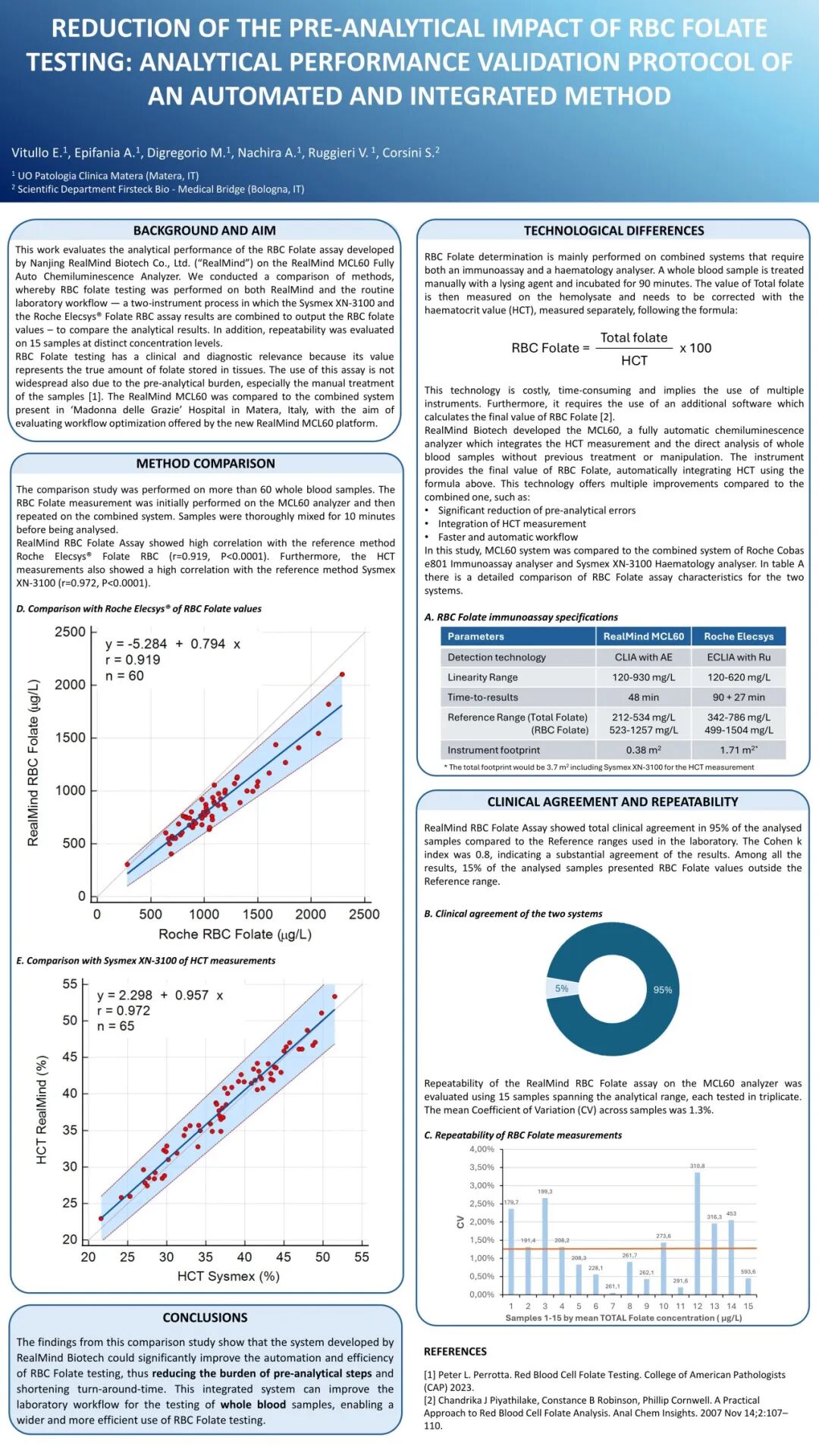 国产民族品牌——仁迈生物,携手意大利合作伙伴,一举发布了四篇学术海报,覆盖全血红细胞叶酸、细胞因子、高敏肌钙蛋白与NT-proBNP,系统展示了其在全血检测与生命全周期健康管理领域的战略布局。其中,关于全过程自动红细胞叶酸检测研究获大会评为“星级文章”,并享有线上优先推广殊荣。这不仅是一项荣誉,更是一个信号:中国IVD企业正从技术“跟跑者”,跃升为创新应用场景与未来趋势的“定义者”。