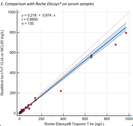 在血清样本的检测中,仁迈hs-cTnT的检测结果与罗氏Elecsys高度相关(r=0.9955),表明仁迈在临床诊断中与金标准具有高度等效性。