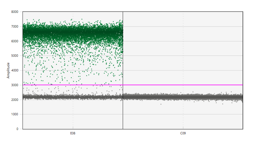 自动阈值:软件基于所有微滴荧光信号的分布,自动计算并放置一条阈值。这种方法减少了主观性,但对于有明显“雨”区的数据,自动阈值可能不稳定。