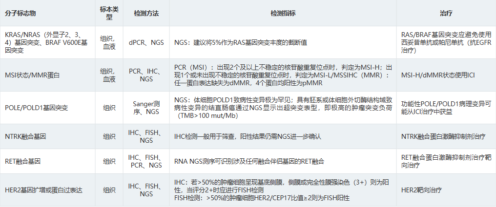 结合国内外相关指南与共识,对结直肠癌精准治疗的相关生物标志物的推荐见下表。