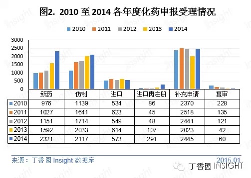 根据丁香园 Insight 数据库统计,2014 年国家食药监管总局药审中心(CDE)共承办药品注册新申请以受理号计达 8880 个,创历史新高。其中化药受理量为 7807,亦是历史之最;而中药受理量与往年相比有所减少,为连续 5 年来最少;生物制品受理量相对稳定。
