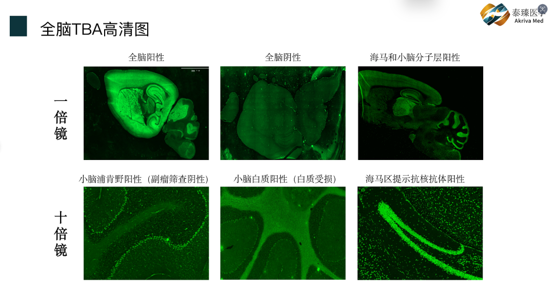 第一,独家领先产品, 你无我有解决行业困境 独家孔板+爬片双试剂 CBA - 孔板检测技术:将表达靶抗原的转染细胞,预先接种在标准化96 孔板中,形成 “即用型” 检测孔板,样本直接加入孔内孵育,通过荧光信号读取抗体结合情况。 CBA - 爬片检测技术,将转染靶抗原的细胞接种在无菌盖玻片(爬片)上,细胞在爬片上贴壁生长并表达抗原,检测时以爬片为载体进行孵育、染色,最终通过显微镜观察荧光定位。 CBA-孔板满足套餐化检测需求,检测多种靶抗原(如自身免疫性脑炎24 项抗体组合),降低单抗体检测样本用量和成本。 CBA-爬片根据套餐预先定制,试剂便于运输,试剂保质期时间更长,助力实验室规范化检测。无需额外制备,直接加样孵育,缩短检测流程,相比孔板能大大降低检测样本用量约1/5,适用于临床特殊患者样本少及科学研究等情况。 泰臻独有孔板+爬片试剂,可对外提供成套产品。服务方面,配合“三班轮值” 模式,俗话说: “当日事当日毕” 。 独家全脑+肝脏TBA 试剂共检 以鼠肝脏组织切片作为样本质控,与全脑组织切片联合使用,同步检测样本中是否可能存在其它自身抗体,影响判读。 独家周围神经组织切片PTBA