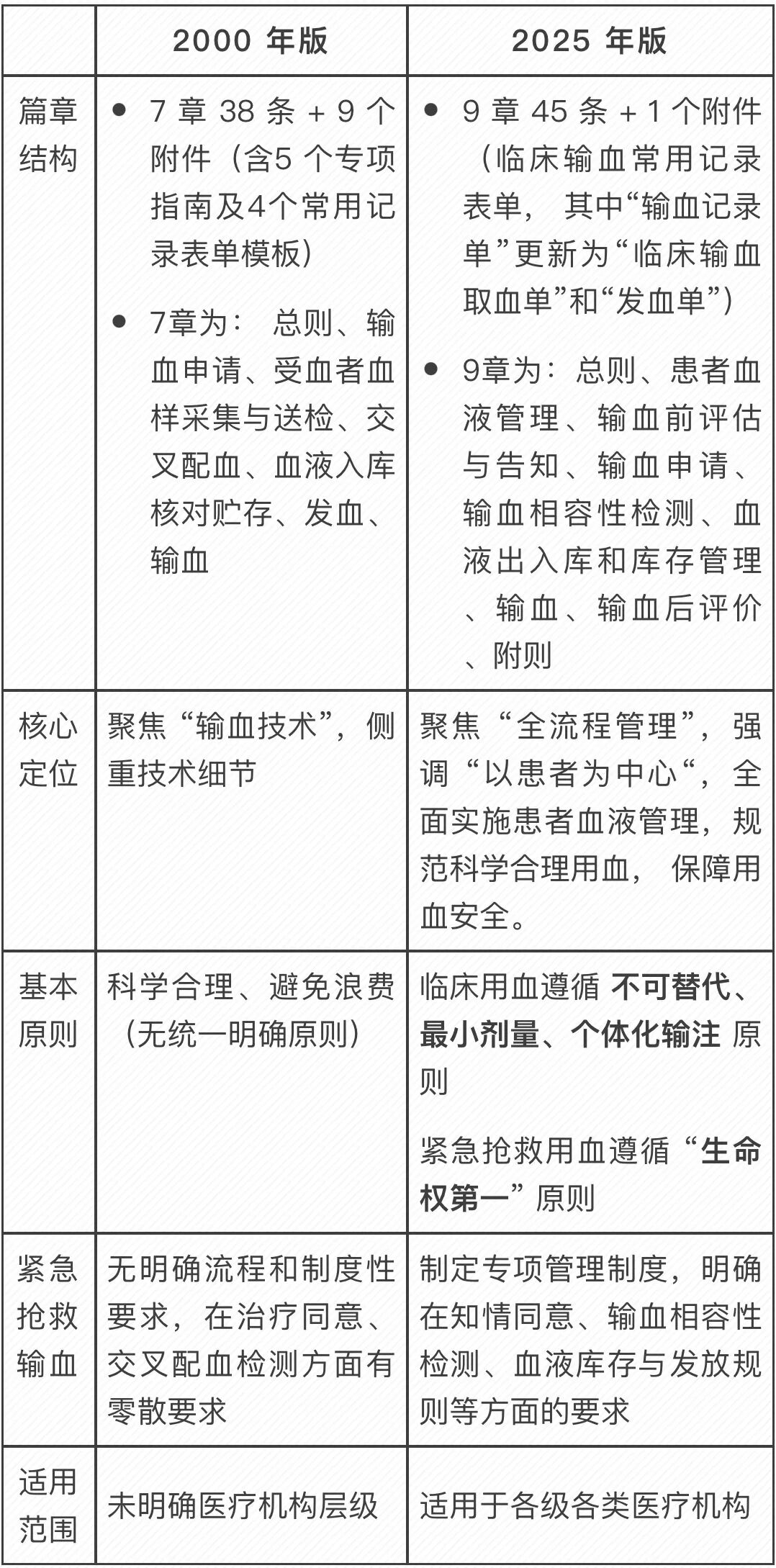作为输血人士,《临床用血技术规范》是我们开展工作的 “指南针”。时隔 25 年,《临床用血技术规范(2025 年版)》2025年12月4日正式出台,相较于《临床输血技术规范》(2000 年版),新版规范在框架、理念、实操要求上均实现了全方位升级!今天,我们拆解一下这些核心变化,一起快速学习实操重点! 一、框架重构: 从 “技术操作” 到 “全流程管理” 新版规范的框架调整堪称 “脱胎换骨”,更贴合临床用血的全链条管控需求: 新版规范新增 “患者血液管理”、“输血前评估与告知”、“输血后评价” 三大核心章节,升级“交叉配血”为“输血相容性检测”,将原来分散的内容系统化,形成突出全面实施患者血液管理,以“预防 - 评估 - 申请 - 检测 - 输注 - 评价” 为主线,结合血液出入库、库存管理的闭环管理体系,更凸显多学科协作、全面质量管理与以患者为中心的重要性。 二、核心章节升级: 这些要点必须掌握 (一)新增三大理念革新,重塑用血逻辑 1. 患者血液管理(第二章):从 “关注输血技术” 到 “以患者为中心” 新版将其作为独立章节,明确 “预防为主、多学科联合” 原则,要求临床用血管理委员会牵头管理,医师负责具体实施,医务、质控、输血等部门负责对实施效果进行评价,各部门协同落实: ◆ 患者血液管理措施:贫血防治、凝血功能优化、减少或避免失血、自体输血、提高患者对失血和贫血的代偿能力以及严格掌握输血指征。 ◆ 2000 年版:只涉及患者血液管理的一些零散内容, 例如严格掌握输血适应证、血液保护和自体输血等,内容分散,缺乏系统性管理要求和明确的以患者为中心。 2. 输血前评估与告知(第三章):新增综合评估要求,告知更充分 ◆ 综合评估:根据患者临床表现、既往史、失血与代偿情况、实验室结果、患者意愿综合评估,无输血替代治疗方法或输血替代治疗方法不能及时有效发挥作用,并且不输血可能会影响患者预后时才选择输血治疗,必要时请输血科会诊。 ◆ 告知要点:输血治疗的目的、方式、必要性、风险及替代治疗方案等。 需患者明确同意并签署输血治疗知情同意书,患者拒绝输血需书面签字确认,拒绝签字的, 如实记入病历。同时明确了紧急输血时的告知要求。 ◆ 对比:2000年版仅侧重输血不良反应和经血传播疾病感染风险告知,几乎没有对输血前评估的要求。 3. 输血后评价(第八章):闭环管理,持续改进科学合理安全用血 ◆ 核心要求:输血后 24 小时内医师需记录血液成分与剂量、输血过程、输血反应及其处理方法,评价输血治疗效果并记入病历,未达预期需联合输血科分析原因、确定措施。 ◆ 质量控制:医务、质控、输血部门联合开展,定期质量评价、相关指标分析与公示 ◆ 对比:2000 年版仅提及输血反应上报,无系统的输血后评价要求 (二)原有章节更新升级,实操性更强 1. 输血申请:剥离无关内容 + 紧急流程明确 ◆ 明确输血申请要求:申请前必须完成 ABO/RhD 血型初检、输血相关感染性疾病筛查,填写临床输血申请单,采集患者血液标本,输血日期之前送达输血科。 ◆ 明确、细化紧急抢救输血要求:制定管理制度和流程,明确启动条件、时限要求和流程安排等,保障患者紧急抢救用血安全。 ◆ 维持特殊治疗要求:治疗性血液成分去除 、单采(新增)和置换需医师向输血科提出申请,输血科与相关科室联合制定治疗和监护方案并实施。 2. 输血相容性检测:科学升级 + 场景细化 ◆ 由“交叉配血“升级为“输血相容性检测”: 体现了从传统的“血型+交叉配血”的检测策略升级为更为科学、高效的血型+抗筛为主结合交叉配血的检测策略。 ◆ 明确总体要求:输血前需要进行输血相容性检测,鼓励医疗机构按照卫生行业标准《输血相容性检测标准》制定输血相容性检测质量控制文件和操作规程。 ◆ 明确、细化血液标本采集要求: