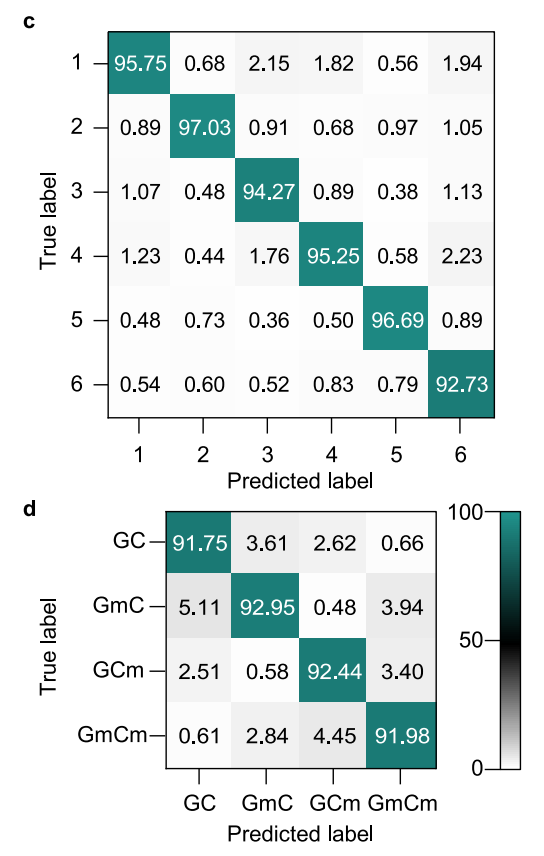 22 nt rRF 28S4014-4035在G7和C19位置含有两个Nm修饰位点,因此存在四种不同的形式GC(未甲基化)、GmC (G7甲基化)、GCm (C19甲基化)和GmCm(双甲基化)。利用纳米孔原始离子电流信号,作者训练了基于ResNet架构的一维深度学习模型,能够对单个分子的甲基化状态和测序文库中的条形码进行高精度分类。结果显示,小RNA甲基化和条形码状态模型的测试集准确率分别为92%和95%(图c, d),并且预测与真实的GmCm甲基化分数之间存在很强的相关性(Pearson r = 0.9971)。