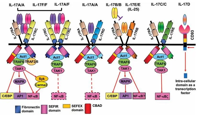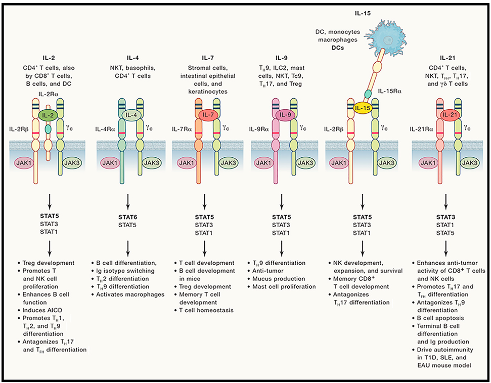 IL-1家族:固有免疫的炎症启动核心 IL-1家族是最早被发现的白细胞介素家族之一,其成员均具有保守的β-三叶折叠结构,受体属于免疫球蛋白(Ig)超家族,信号传导主要依赖NF-κB和MAPK通路激活,核心功能是启动固有免疫应答、调控炎症反应强度,是连接固有免疫与适应性免疫的重要桥梁。与其他白细胞介素家族不同,IL-1家族成员并非仅由免疫细胞分泌,上皮细胞、成纤维细胞等非免疫细胞在应激或损伤状态下也可大量表达,使其成为机体应对外界刺激的“第一道免疫信号枢纽”。 10.1038/s41423-025-01358-8 (一)核心成员组成与特性 目前已发现的IL-1家族成员共11个,包括促炎分子、抗炎分子及功能尚未完全明确的分子,其中核心功能明确的成员主要有:IL-1α、IL-1β、IL-1Ra(IL-1受体拮抗剂)、IL-18、IL-33、IL-36α/β/γ及IL-36Ra等。从分子特性来看,IL-1α和IL-1β是该家族最经典的促炎分子,二者氨基酸序列同源性仅26%,但功能高度重叠,均可结合IL-1受体(IL-1R1)启动炎症信号;不同之处在于,IL-1α可作为膜结合型分子表达于细胞表面,也可通过细胞坏死释放到胞外,而IL-1β则需在炎症小体(如NLRP3炎症小体)的作用下被 caspase-1剪切为成熟体后才具备生物学活性。 IL-1Ra是家族中唯一的抗炎分子,其结构与IL-1α/β高度相似,可竞争性结合IL-1R1,但无法启动信号传导,从而阻断IL-1α/β的促炎作用,是机体维持炎症平衡的关键分子。IL-18和IL-33则属于“警报素”类分子,正常状态下主要储存于细胞内,当细胞受到损伤或感染时释放到胞外,分别调控Th1和Th2型免疫应答,在抗感染和过敏反应中发挥特异性作用。IL-36家族成员(IL-36α/β/γ)主要表达于皮肤、呼吸道黏膜等屏障组织,核心功能是调控局部炎症反应和免疫细胞浸润,而IL-36Ra则作为其特异性拮抗剂,维持局部免疫微环境稳定。 (二)信号传导机制 IL-1家族成员的信号传导均依赖IL-1R家族受体,其中IL-1α/β、IL-36α/β/γ主要结合IL-1R1,IL-18结合IL-1R5(IL-18Rα),IL-33结合IL-1R9(ST2)。以IL-1β为例,其信号传导过程可分为三个核心步骤:第一步,成熟IL-1β与细胞膜表面的IL-1R1结合,诱导IL-1R1构象改变,进而招募共受体IL-1R3(AcP)形成异源二聚体复合物;第二步,复合物通过胞内TIR结构域与衔接蛋白MyD88结合,MyD88进一步招募IRAK家族激酶(IRAK1、IRAK4)形成信号复合物;第三步,IRAK激酶磷酸化激活下游的TRAF6,TRAF6通过泛素化修饰激活TAK1,TAK1进而激活NF-κB和MAPK(ERK、JNK、p38)通路,最终促进促炎因子(如TNF-α、IL-6)、趋化因子(如CXCL8)及黏附分子(如ICAM-1)的基因转录。 IL-1Ra的抗炎机制则是通过竞争性结合IL-1R1实现的,其与IL-1R1的亲和力高于IL-1α/β,结合后可阻止IL-1R1与IL-1R3形成功能性复合物,从而阻断下游信号传导,抑制炎症反应的过度激活。IL-18和IL-33的信号传导过程与IL-1β类似,均依赖MyD88-IRAK-TRAF6信号轴,但下游激活的转录因子存在差异:IL-18主要激活STAT1和NF-κB,促进IFN-γ分泌;IL-33则主要激活STAT6和NF-κB,促进IL-4、IL-5、IL-13等Th2型细胞因子分泌。 (三)核心生物学功能 1. 启动固有免疫应答:IL-1α/β是机体炎症反应的“首发因子”,当机体受到细菌、病毒感染或组织损伤时,巨噬细胞、中性粒细胞等固有免疫细胞首先分泌IL-1α/β,通过诱导内皮细胞表达黏附分子(ICAM-1、VCAM-1),促进中性粒细胞、单核细胞向炎症部位浸润,同时激活巨噬细胞分泌更多促炎因子,形成炎症放大效应,快速清除病原体或修复损伤组织。在感染早期,IL-1α/β还可诱导树突状细胞(DC)成熟,增强其抗原提呈能力,为适应性免疫应答的启动奠定基础。 2. 调控适应性免疫分化:IL-18与IL-12协同作用,可显著促进Th0细胞向Th1细胞分化,并增强Th1细胞和NK细胞分泌IFN-γ,强化机体抗胞内病原体(如结核分枝杆菌、病毒)和抗肿瘤免疫应答;此外,IL-18还可促进CTL细胞的活化和增殖,提升其杀伤靶细胞的能力。IL-33则主要诱导Th0细胞向Th2细胞分化,促进B细胞分泌IgE,同时激活肥大细胞和嗜酸性粒细胞,参与过敏反应和抗寄生虫感染免疫;在组织损伤修复过程中,IL-33还可促进成纤维细胞增殖和胶原合成,加速组织愈合。 3. 维持炎症平衡:IL-1Ra与IL-1α/β的动态平衡是维持机体炎症稳态的关键。正常生理状态下,IL-1Ra的表达水平较低,当炎症反应启动后,IL-1Ra可通过自分泌或旁分泌方式大量表达,与IL-1α/β竞争结合IL-1R1,避免炎症反应过度激活对正常组织造成损伤。此外,IL-36Ra通过阻断IL-36家族成员的信号传导,可有效抑制皮肤、呼吸道等黏膜组织的过度炎症反应,预防自身免疫性疾病的发生。 共用γ链家族:适应性免疫的发育与活化枢纽 共用γ链家族(Common γ Chain Family,γc家族)属于Ⅰ型细胞因子受体超家族的核心亚类,其最显著的特征是所有成员的受体均包含共同的信号亚基——γ链(γc,CD132)。γc是细胞因子信号传导的关键分子,通过与不同的配体结合亚基形成异源二聚体或三聚体受体,介导JAK3-STAT信号通路激活,核心功能是调控T细胞、B细胞、NK细胞等适应性免疫细胞的发育、存活、增殖及活化,是维持机体适应性免疫功能完整的核心家族。 (一)核心成员组成与受体特征 10.1016/j.immuni.2019.03.028. 共用γ链家族的核心成员包括IL-2、IL-4、IL-7、IL-9、IL-15及IL-21,这些成员的氨基酸序列同源性较低,但受体均以γc作为共同信号亚基。根据受体组成的差异,可将家族成员分为两类:一类是受体由配体结合亚基与γc组成的异源二聚体,包括IL-4(受体为IL-4Rα+γc)、IL-7(IL-7Rα+γc)、IL