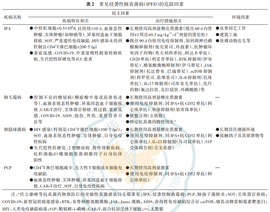 IPFD的危险因素包括了宿主因素和环境因素(表2)。免疫抑制宿主及ICU患者均是IPFD的高危人群。肺隐球菌病在国内更常见于免疫功能正常人群。控制不良的糖尿病是肺毛霉病首要的危险因素,近年来,异基因造血干细胞移植受者等血液病患者继发毛霉病的例数逐渐增多。CD4+T淋巴细胞减少是PCP的独立危险因素。基础疾病及相关治疗所致的免疫功能低下,导至非AIDS患者的IPFD发病率持续上升。此外,生物制剂和靶向药物引发的免疫受损,增加了真菌感染的风险。