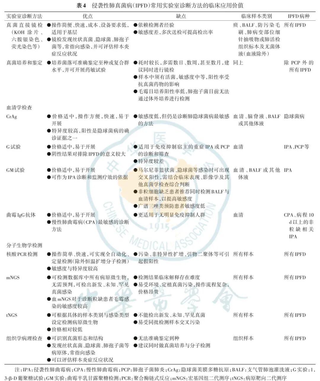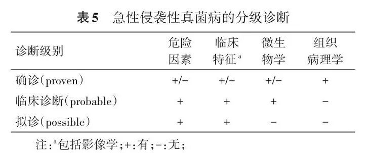 拟诊(possible):具备至少1项危险因素(表2)、1项临床特征(表3),但无微生物学证据。为了避免过度诊治,免疫功能正常的非重症患者建议在确诊和临床诊断后再启动抗真菌治疗,而异基因造血干细胞移植、实体器官移植、CAR‑T治疗、血液肿瘤患者拟诊可启动治疗。
