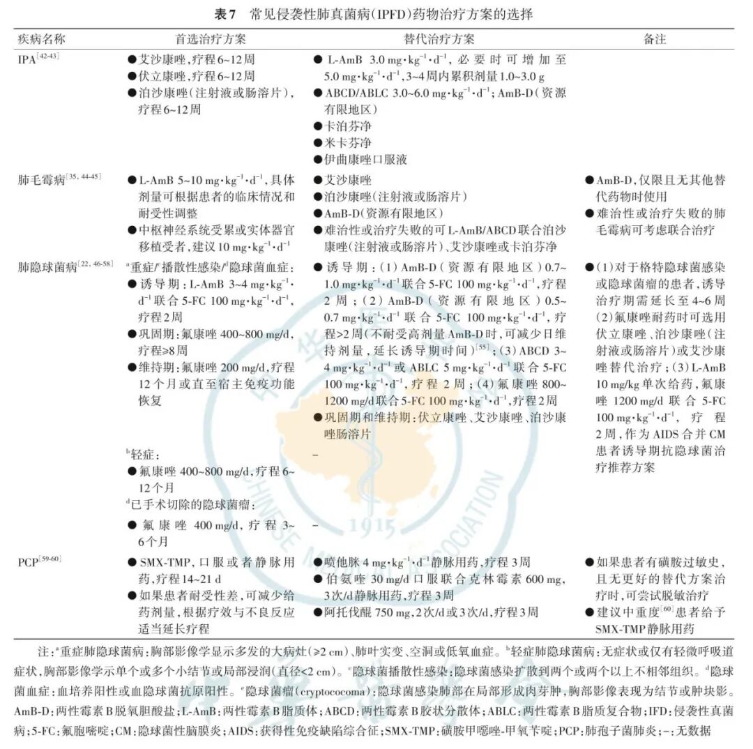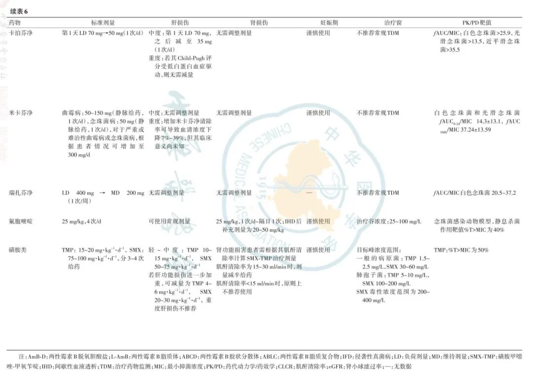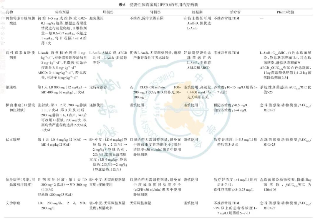 IPFD常用的治疗药物包括多烯类、三唑类及棘白菌素类(表6)。临床用药时需结合其药代动力学(pharmacokinetics,PK)、药效学(pharmacodynamics,PD)特征以及患者的特殊病理生理状况合理选择。两性霉素B脱氧胆酸盐(AmB-D)肾毒性高,两性霉素B脂质体(L-AmB)和两性霉素B胶状分散体(ABCD)肾毒性显著降低,在肝肾功能不全患者中通常无需调整剂量。多数三唑类抗真菌药口服生物利用度良好,组织分布广泛,尤其是肺支气管组织中渗透率较高。伏立康唑、伊曲康唑主要通过细胞色素P450(CYP)酶代谢,并对该酶系统具有抑制作用;泊沙康唑主要经尿苷二磷酸葡萄糖醛酸转移酶1A4(UGT1A4)代谢;而艾沙康唑在肝脏中的代谢程度较低。氟康唑主要经肾脏排泄,需根据肌酐清除率调整剂量,艾沙康唑的排泄途径涉及肝肾两者,相对均衡。需注意的是,唑类抗真菌药物具有潜在的胚胎毒性,妊娠早期应禁用。棘白菌素类药物包括卡泊芬净、米卡芬净和瑞扎芬净,蛋白结合率均大于90%。卡泊芬净、米卡芬净主要通过CYP酶代谢,瑞扎芬净药物相互作用风险较低,其代谢产物主要经胆汁排泄,仅少量经肾脏排出。棘白菌素类在肝肾功能受损患者中安全性相对较好,但妊娠期仍应慎用。老年患者常合并多种基础疾病,使用抗真菌药物时需特别关注肝肾功能变化对药物代谢产生的潜在影响。