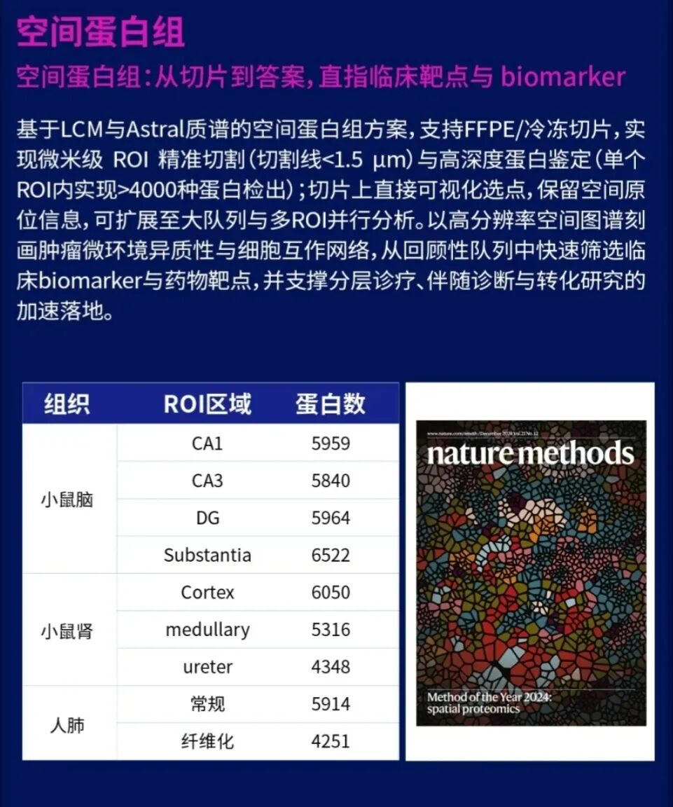 榕嘉生物自主研发Foresight® 空间组学平台。 大类上属于循环荧光染色,用DNA 标签代替了传统二抗;辅以杂交链式反应(HCR)做线性扩增,解决了国外主流DNA标签技术没有信号放大的缺陷;采用oligo 链洗脱条件温和,不会破坏样本,这也是目前淬灭和漂白技术的最大困扰。 目前每轮能测五标六色,理论无限轮,现已稳定做到12 轮,达到60标61色,国内技术最高水平。 艾克发生物,超多重空间蛋白组技术服务上新 引用艾克发AlphaXBio产品及服务的文章平均影响因子已达16+ 艾克发同时提供30色自主超多重空间蛋白组服务,以及与榕嘉生物的合作服务。 明虹天成,循环TSA及漂白迭代 基于循环TSA(Cyclic mTSA)以及漂白迭代技术,可高通量实现对常规临床石蜡切片的超多指标共标记(3-30靶标)。 爱博泰克,可切割荧光探针,25标26重 爱博泰克BioCanvas™ 超多重试剂,采用以可切割酪胺荧光探针 (CFP™) 为中心的多重策略,该策略允许染色、成像和荧光团切割的循环。 在每个循环中,多个蛋白质靶标首先被来自特异性的一抗识别。随后,用二抗和可裂解的荧光酪胺(CFT™)对第一个靶标进行荧光染色。HRP催化CFP与靶蛋白抗原上酪氨酸残基之间的偶联反应。成像后,荧光团以接近 100% 的效率,被特异性剪切试剂去除。通过重复染色循环,可以在单样本中,原位定量分析超多重靶蛋白。 每轮4个抗体,目前做到7轮,25标26重。 华大智造,24重多重荧光 传统的一抗+荧光二抗,温和洗脱,最大染色重数:24-plex。 茵菲空间多组学,以IMC为核心的空间多组学 迈维代谢,空间组学三次方 华盈生物,PCF与LCM-MS 华盈生物日前甄选了2025年发表的文章16篇,其中3篇有关空间蛋白组学。 华盈生物2025 —— 绘生命全景,解空间奥秘:以多维蛋白组学技术引领创新研究新范式! PCF空间单细胞蛋白组:复旦大学中山医院发表在《Cell》上的一篇文章,揭示了癌细胞通过ATF4-SLIT2-CGRP轴激活伤害感受神经元,远程重塑肿瘤引流淋巴结(TDLN)的免疫状态,从而逃避免疫监视的新机制,为联合神经调节和免疫治疗提供了理论基础。 PCF空间单细胞蛋白组,助力研究者发现了众多免疫细胞中,只有肿瘤相关巨噬细胞(TAM)和伤害感受神经元具有显著的共定位关系,为揭示“TAM激活伤害感受神经元”的机制假说提供了直接的空间原位证据。 中国医学科学院肿瘤医院在《Signal Transduct Target Ther》上发表题目为《Characterization of the extrinsic and intrinsic signatures and therapeutic vulnerability of small cell lung cancers》的文章,全面描绘了小细胞肺癌(SCLC)的单细胞和空间图谱,系统解析了SCLC的肿瘤微环境组成和癌细胞异质性,并首次报道了FAK剪接变体可作为SCLC的预后标志物和治疗靶点。 PCF空间单细胞蛋白组检测服务,助力研究者揭示了肿瘤组织和癌旁组织显著差异的免疫微环境特征,并发现了对免疫治疗反应不同的患者中,肿瘤细胞上抗原呈递分子MHC表达的显著异质性,为理解SCLC免疫逃逸机制提供了新视角。 LCM-MS空间蛋白组:长征医院在《Cell》上发表题为《An iPSC-derived CD19/BCMA CAR-NK therapy in a patient with systemic sclerosis》的文章,该研究设计并开发了iPSC来源的CD19/BCMA双靶点的CAR-NK细胞产品QN-139b,并成功应用在一例难治性硬皮病患者中,为重症自身免疫病提供了变革性治疗方案。 LCM-MS空间蛋白组发现了CAR-NK灌输后,在患者皮肤的基底层、汗腺层、上皮层和真皮胶原层中不同的生物学通路被激活,揭示了QN-139b通过双靶点清除致病B细胞,可以重塑免疫稳态和逆转组织纤维化。