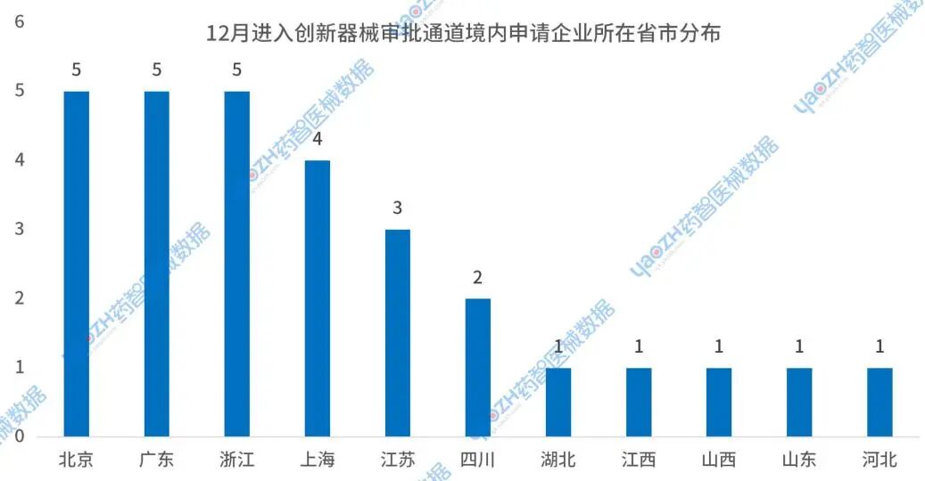 2025年12月,国家药监局和地方药监局一共公示了31款器械进入创新医疗器械特别审查通道。其中国家局发布了18款产品,地方药监局发布了13款产品。 资料来源:药监局官网、药智医械数据 此次申请的企业主要集中在北京、广东、浙江等省市。申请的产品涉及到12个产品器械分类,主要集中在无源植入器械、体外诊断试剂、有源手术器械等产品。 资料来源:药监局官网、药智医械数据 资料来源:药监局官网、药智医械数据 2025年12月进入创新器械审批通道的器械 资料来源:药监局官网、药智医械数据 1 一次性使用颅内激光球囊: 杭州矩正医疗科技有限公司 杭州矩正医疗科技有限公司成立于2021年,总部位于杭州市未来科技城,在杭州、安吉均设有生产基地,是业内首家从事血管内光化学交联技术的高科技企业。颅内激光球囊配合激光发生器治疗症状性颅内动脉粥样硬化性狭窄。据公司官网报道,其颅内激光球囊扩张导管已经获得美国FDA突破性医疗器械认定。 2 肺部射频消融系统: 杭州堃博生物科技有限公司 杭州堃博生物科技有限公司成立于2016年,已于2021年赴港上市。公司专注于肺部疾病微创介入诊疗产品的研发,尤其是慢阻肺及肺癌的介入治疗。2025年6月该公司的肺部射频消融系统作为国内首台肺部消融产品已经获批上市。 3 一次性使用压力监测脉冲电场消融导管: 伯恩森斯韦伯斯特(以色列)有限责任公司 伯恩森斯韦伯斯特(以色列)有限责任公司是由1996年强生收购Cordis Webster和Biosense后,合并而成,公司专注于心律失常诊断与治疗技术。压力监测脉冲电场消融导管一般与压力监测脉冲电场消融设备配合使用,用于心律失常的治疗。压力监测确保导管与心脏组织接触稳定,防止压力过大或过小,提升疗效和安全性。目前已经有3款此类导管在境内上市。 4 可吸收闭合夹及施夹钳: 大瓷生物医疗科技(江苏)有限公司 大瓷生物医疗科技(江苏)有限公司成立于2022年,是国内具备自主研发生产医用聚对二氧环己酮(PPDO)材料的企业之一。一般可吸收的闭合夹使用聚对二氧环己酮制备,用于外科手术中夹闭血管或闭合管状组织。目前境内已经上市的同类型产品有16个。 5 可吸收医用胶: 北京博辉瑞进生物科技有限公司 北京博辉瑞进生物科技有限公司成立于2012年,公司目前有包括细胞外基质源生物材料(SIS材料)技术平台、可吸收医用胶技术平台、骨修复材料平台、多肽/外泌体技术平台等多个核心材料技术平台。 目前上市的三类医用胶一般有血管封合类胶,此类一般为双组分,形成交联结构。还有一类是皮肤创口的缝合剂,一般都是基于氰基丙烯酸酯遇水快速聚合形成黏合力固化。三类的可吸收医用胶类一般有基于明胶的和基于改性聚乙二醇聚合物的产品。 6 术中神经监护及甲状旁腺检测仪: 北京图灵至亦医疗科技有限公司 北京图灵至亦医疗科技有限公司成立于2023年,其母公司是北京图灵微创医疗科技有限公司。 术中神经监护及甲状旁腺检测仪主要是为了解决甲状腺手术中的两大高发并发症:喉返神经损伤与甲状旁腺误切除。依据公开的资料显示,喉返神经监测主要是电极刺激喉返神经,接受返回的肌电信号,用于判断喉返神经的功能完整性。甲状旁腺的监测利用荧光示踪法:甲状旁腺在近红外激光(785nm)照射下发出更强的近红外自体荧光(820nm)特性来区别于其他组织。此产品首创了光电混合集成的术中神经监测及荧光示踪光电检测平台,不仅能同时实现喉返神经监测及甲状旁腺示踪,同时还能独家提供旁腺的血供监测功能。 7 脉冲消融系统和一次性使用脉冲消融导管: 融和医疗科技(浙江)有限公司 融和医疗科技(浙江)有限公司成立于2022年,其专注于经支气管呼吸介入创新医疗产品设计开发。一般脉冲电场技术,通过瞬时的高压电场能量在异常细胞表面形成不可逆微孔导至细胞膜破裂,导至细胞死亡,避免了对周围正常组织的损伤。当前利用脉冲电场技术消融的已上市产品已经有12个。 8 植入式心脏除颤电极导线: 美敦力公司 美敦力公司成立于1949年,总部位于美国明尼苏达州,公司在心血管、糖尿病、神经调节、外科手术、脊柱手术等多个领域具有领先的技术和产品。植入式心脏除颤电极导线与心脏的电信号相连,能够持续监测心脏的节律, 当心脏出现危及生命的节律失常(如室颤)时,导线能迅速给心脏发出电击,帮助恢复正常的心律。目前境内已有12款植入式心脏除颤电极导线上市。 9 介入式左心室辅助系统: 丰凯利医疗器械(上海)有限公司 丰凯利医疗器械(上海)有限公司成立于2015年,是一家微创伤血流动力学管理平台企业。介入式左心室辅助系统一般用于经皮冠状动脉介入治疗,为提供左心室辅助。目前境内已有一款同类型产品上市。 10 肿瘤膝关节假体: 北京力达康科技有限公司 北京力达康科技有限公司成立于1998年,专门从事人工关节研究、生产。 骨肿瘤切除之后一般骨缺损比较大,有较大的残腔,使得肿瘤型人工关节较普通人工关节有着更高的感染率,这是人工关节最严重的并发症,目前5年之内肿瘤型人工关节假体周围感染率有20%,另外一个常见的并发症是无菌性松动。肿瘤型人工关节的需要重建的缺损范围、固定方式、材料性能和周围软组织特性决定了其开发的特殊性。 11 骨粘合材料: 杭州源囊生物科技有限公司 杭州源囊生物科技有限公司