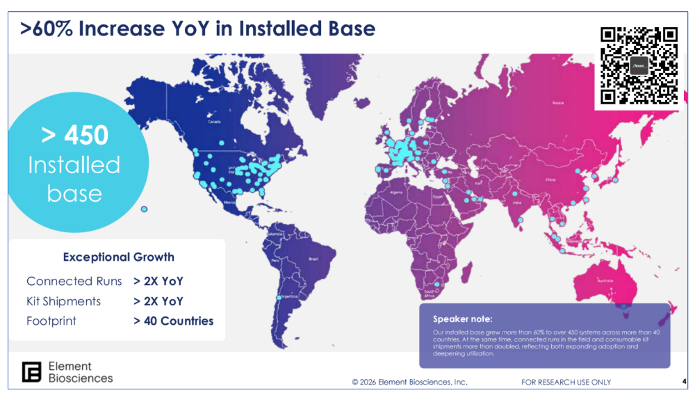 根据Elment公布的数字,截至2025年底已经超过450台测序仪安装,年增长率达到60%。