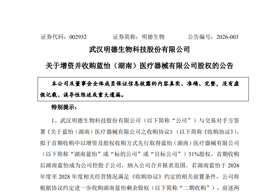 | 1月19日晚,武汉明德生物科技股份有限公司发布公告,宣布通过增资及股权收购方式,以3570.10万元取得蓝怡(湖南)医疗器械有限公司(下称“湖南蓝怡”)51%股权,实现控股。此举标志着明德生物在医疗器械领域进一步拓展业务版图,加码慢病管理赛道。根据公告,本次收购分为两阶段进行:首期收购完成后,明德生物将持有湖南蓝怡51%股权,标的公司成为其控股子公司,纳入合并报表范围。若湖南蓝怡在2026年至2028年满足特定经营条件,明德生物将进一步收购其剩余股权,最终实现100%全资控股。湖南蓝怡成立于2020年9月,是一家专注于体外诊断(IVD)仪器、试剂研发生产的高新技术企业,拥有糖化血红蛋白高效液相色谱法(HPLC)等核心技术,相关产品已获市场认可。财务数据显示,湖南蓝怡目前仍处于投入期,2024年及2025年前三季度净利润均为亏损,但伴随国家将糖化血红蛋白检测纳入老年体检项目,其市场前景被看好。公告披露,本次交易定价基于评估机构出具的收益法评估结果,标的公司全部权益评估值为5100万元。明德生物表示,此次收购有助于公司实现“急危重症+慢病管理”业务协同,完善产业链布局,提升对医疗机构的全流程服务能力,同时拓展海外与基层市场。值得注意的是,交易协议中设置了业绩承诺与估值调整机制:若湖南蓝怡2026年营收未达约定目标,转让方需进行补偿;若2026年业绩增长符合预期,明德生物将相应调增收购对价。此外,若2026-2028年平均净利润超过3000万元,管理层还可获得超额奖励。明德生物在公告中也提示了相关风险,包括业务整合不及预期、商誉减值、二期收购条件未达成等不确定性。公司表示将积极推进后续整合,防范经营风险。此次收购是明德生物在IVD领域纵深布局的重要一步,也是其构建“院前-院中-院后”全流程服务体系的关键举措。市场关注后续整合成效,以及湖南蓝怡能否在政策利好下实现业绩转折。