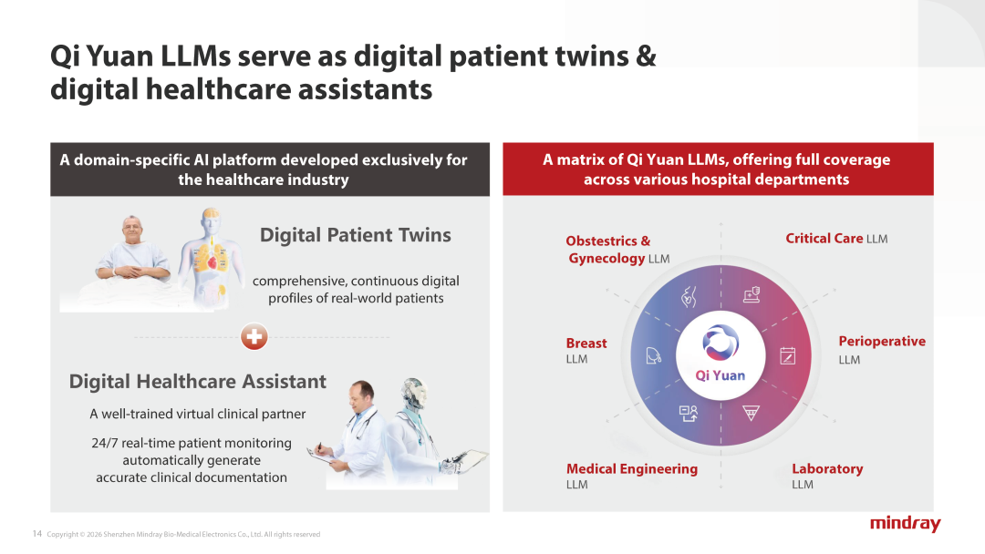 | 全球化蓝图、流水业务扩张、数智化转型的三角战略已经清晰地绘制在迈瑞医疗未来十年的增长版图上。摩根大通全球医疗健康大会上,迈瑞医疗首次系统公布了公司未来十年的增长蓝图。公司董事会秘书李文楣透露,公司未来增长将围绕“加速全球化”“流水业务拓展”“数智化转型”这三大核心支柱展开。  这不仅是迈瑞针对自身发展的战略升级,也透露出中国医疗器械龙头企业应对全球变局、提升国际竞争力的深层思考。迈瑞医疗全球化战略迎来新的里程碑。“加速全球化”被明确为公司未来增长的核心支柱。李文楣在演讲中透露,迈瑞医疗设定了清晰的全球化进阶目标:将国际业务收入占比从当前的50% 提升至 60% 以上。 这意味着未来迈瑞的国际业务比重将超过国内业务,这是其成为全球医械巨头的必经之路。迈瑞的国际业务版图已相当可观。截至目前,其产品和服务覆盖全球190多个国家和地区,已在全球40多个国家搭建起64家子公司、5个研发中心、14个生产基地的全球化网络。国际员工队伍突破3000人,其中90%以上为本地员工。“不同于传统跨国企业的营销导向模式,公司秉持深度本土化理念。”李文楣强调,在新兴市场,迈瑞尤其注重赋能本地医疗能力建设。例如在中东和非洲地区,已建立20多个超声培训学校,为当地培养并认证数千名超声临床医生。在关税、贸易壁垒与供应链风险加剧的背景下,加快建设海外平台成为国际业务长期主义的关键。李文楣表示,公司正通过推进本地生产、供应链采购与研发的全方位落地,稳步实现从单纯的医疗设备供应商向赋能全球医疗系统的战略合作伙伴转型。流水业务(或称耗材业务)是迈瑞医疗未来增长的第二个核心支柱。该业务涵盖IVD试剂、微创手术耗材、微创介入耗材、IT与用户服务等,2025年上半年已贡献公司总营收的40%。2024年,迈瑞体外诊断领域在国内可及市场的占有率不及15%,在全球可及市场中占有率约为4%;微创外科和微创介入在全球可及市场中占有率仅0.8%。李文楣坦言,除了IVD仍有巨大的市占率提升空间以外,公司的微创外科、微创介入等耗材业务目前的占有率甚至可以忽略不计,而这两块业务的合计市场容量大于IVD,行业仍有很大的成长空间。为加速流水业务突围,迈瑞正从全球供应链布局与业务生态构建双向发力。一方面,公司积极推进海外本地化供应链与生产设施建设;另一方面,精准布局赛道扩容。公司通过收购惠泰医疗成功切入心血管介入领域,同时规划构建涵盖经皮、经自然腔道、经呼吸道等多介入路径的“泛介入治疗”生态。在微创外科领域,在聚焦胸外科与普外科的基础上,进一步向妇科、泌尿外科等多科室延伸,并重点研发适配各科室临床需求的手术机器人。“数智化转型”是迈瑞医疗未来十年增长的第三大核心支柱。李文楣指出,迈瑞的数智化解决方案构建了清晰的五层架构。前四层已落地应用,第五层正处于研发攻坚阶段:第一层为设备基础层,第二层为设备融合层,第三层为IT系统层,第四层为AI层,第五层为闭环自强化层。2024年底,迈瑞推出了“启元”医学大模型家族,应用从重症监护拓展至围手术期、乳腺超声、妇产超声、IVD检验、医工管理等多个领域。据李文楣介绍,“启元”医学大模型具备双重核心能力:一方面可构建患者“数字孪生体”,另一方面能充当“智能医疗助手”。 提供7×24小时实时患者监护、自动生成精准临床文书,为多场景医护人员提供高风险场景下的关键决策支持。值得关注的是,所有AI大模型均采用本地部署模式,全力保障患者隐私安全。李文楣特别强调了“具身智能”在迈瑞未来战略中的核心地位。“具身智能”在“十五五”规划建议中被列为前瞻布局的未来产业之一。李文楣阐释了迈瑞对“具身智能”的理解:设备作为“感官”采集数据,IT系统作为“神经”传输整合数据,AI作为“大脑”生成辅助诊疗决策并反馈给设备硬件完成执行。未来“黑灯工厂”实验室、智能麻醉机器人、智能超声机器人等前沿产品将逐步在迈瑞落地。这些创新将直接挑战医疗领域的“不可能三角”——即质量、可及性与成本之间的传统矛盾。目前,迈瑞的数智化解决方案已在全球多个地区验证了其价值。在挪威,miCare与mWear可穿戴设备助力当地医院提升监护效率;在沙特,miImaging为全球最大虚拟医院提供支撑;在中国四川,miInnlab构建的“2+6+X”江油区检模式成为全国基层医疗协作标杆。在上海仁济医院,搭载“启元”医学大模型的数智医疗中心解决方案,使肝移植手术时间缩短约50%。李文楣在总结中强调,迈瑞医疗的三大增长支柱不是孤立的,而是相辅相成、协同发力的有机整体。全球化布局为流水业务拓展提供了市场基础,数智化转型则为两者注入了科技动能。这一战略规划的公布,标志着迈瑞医疗从中国领先的医疗器械企业向全球医疗科技领导者的转型已进入加速期。参考资料:迈瑞医疗