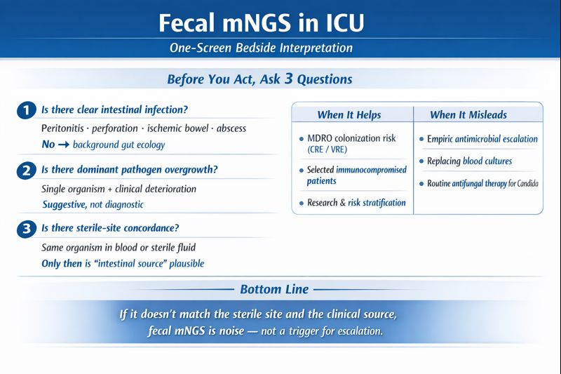 夜班收治一位 72 岁男性,感染性休克。入院时乳酸升高、去甲肾上腺素(Norepinephrine, NE)维持血压,腹胀、肠鸣音弱,既往长期卧床、近期广谱抗生素暴露。腹部 CT 没看到明确穿孔或脓肿,仅提示肠壁水肿、少量腹水。血培养暂未回报,痰培养混杂。值班同事说:“担心肠源性菌群入血,先把粪便做个宏基因组测序(Metagenomic Next-Generation Sequencing, mNGS)看看,别等到来不及。” 第二天粪便 mNGS 回来:肺炎克雷伯菌、屎肠球菌、白色念珠菌、拟杆菌属、梭菌属……一长串,还带若干耐药基因。团队一度很紧张:是不是要把抗菌谱加到“覆盖所有”?是不是要加抗真菌?是不是要升级到碳青霉烯+糖肽+棘白菌素? 这类场景,在 ICU 并不少见。问题是:做粪便 mNGS,到底是在帮助决策,还是在制造噪音与误导? 一、先把逻辑捋清:粪便里“有菌”是常态,不是诊断 肠道本来就是人体最大的微生物库,“在粪便里检出细菌/真菌”几乎是必然。危重症状态、肠道灌注不足、肠黏膜屏障受损、营养改变以及广谱抗生素使用,会让肠道微生态迅速从“多样性丰富的共生群落”塌缩为“低多样性、条件致病菌占优势的‘病理群落(pathobiome)’”。这并不等同于“这些菌正在侵袭并导至脓毒症”,但它确实意味着:你更容易在报告里看到‘可疑致病菌’成片出现【1-4】。 换句话说:粪便 mNGS 更像是在回答“肠道里有什么”,而不是在回答“谁在血里/腹腔里作恶”。 二、为什么粪便 mNGS 在 ICU 特别容易“看上去很吓人” 1)危重症会把“背景菌”推到台前 多项 ICU 微生物组研究显示,危重症常见特征是多样性下降、肠杆菌科(如肠杆菌、克雷伯菌)扩张,与院内感染风险、免疫反应失衡相关【3-5】。于是你做粪便 mNGS,看到克雷伯菌、肠球菌“高丰度”,并不稀奇——这可能是“危重症生态位”而非“侵袭证据”。 2)“检出”≠“致病”,这是 mNGS 的核心陷阱 mNGS 的已知难点之一,就是区分定植、污染、正常菌群与真正感染;此外,流程、数据库、报告阈值与解读标准不统一,也会放大误读风险【6-8】。对粪便这种“本就多菌”的标本,上述问题更突出:报告越长,越容易让人产生“必须都覆盖”的错觉。 3)耐药基因“看得到”,但不等于“此刻就该按它开药” 粪便宏基因组能提示耐药基因谱,但耐药基因与具体菌株、表达水平、是否导至当前感染之间并非一一对应;把“耐药基因”直接转译为“升级抗菌药”的确定性证据,风险很高(过度治疗、生态破坏、真菌替代、艰难梭菌相关腹泻等)。 三、那“肠源性入血”到底存不存在?存在,但需要更严格的证据链 “肠道菌群移位/转位(bacterial translocation)”作为概念并不新,肠屏障受损与系统炎症、器官功能障碍之间的关联也有大量机制与临床研究支持【2-4】。 更进一步,有研究在特定人群/特定设计下观察到“肠道定植先于血流感染”,并通过基因组层面的方法去做关联【9】。 关键在于:“肠源性”是一个需要“匹配证据”的诊断,不是一个靠粪便 mNGS 单点结果就能成立的推断。 四、把“预先做粪便 mNGS”拆成一个可执行的临床问题 建议把决策拆成 4 步,用来判断它是“信息增益”还是“噪音放大”。 第 1 步:你希望它回答什么问题?(先写在病程里) 常见的期待有三类: 如果你真正想回答的是 1)或 2),那粪便 mNGS 单独做,往往回答不了;因为它缺乏“无菌部位证据”。这也是最常见的“误导来源”【6-8】。 第 2 步:有没有更该优先的“无菌部位”样本? 怀疑脓毒症,优先级通常是: · 血培养(规范采集、足量、尽量在抗菌药前) · 影像提示的无菌腔隙(腹水、脓肿穿刺液等) · 需要时可考虑血浆 mNGS 作为补充,但同样必须结合临床语境解读【6-8】 无菌部位阳性 + 临床符合感染,才有更强的可解释性;而粪便天然不具备这一点。 第 3 步:如果已经做了粪便 mNGS,如何“去噪”解读? 我们更倾向于用“三问”把它从“病原学证据”降级为“生态/线索证据”: (1)临床综合是否支持“肠道为主要感染源”? (2)是否出现“优势单菌占位”并与病程高度同向? (3)能否建立“同一菌”的跨部位一致性? 第 4 步:它在 ICU 什么时候更可能“有意义”? 相对更有意义的情形,往往不是为了“指导当下扩谱”,而是用于: 五、回到开头病例:怎样避免“被粪便 mNGS 带节奏”? 这个病例里,如果没有明确腹腔感染灶、没有无菌部位一致证据,那么粪便 mNGS 最合理的定位是: 更稳健的路径是: 六、给 ICU 同行的一句话总结 “预先做粪便 mNGS”最常见的价值,不是帮你‘锁定病原并扩谱’,而是告诉你‘这个病人的肠道生态正在塌缩、条件致病菌在扩张’。 参考文献 1.Alverdy J C, Krezalek M A. Collapse of the microbiome, emergence of the pathobiome, and the immunopathology of sepsis[J]. Critical care medicine, 2017, 45(2): 337-347. 2.Klingensmith N J, Coopersmith C M. The gut as the motor of multiple organ dysfunction in critical illness[J]. Critical care clinics, 2016, 32(2): 203. 3.Krezalek M A, DeFazio J, Zaborina O, et al. The shift of an intestinal “microbiome” to a “pathobiome” governs the course and outcome of sepsis following surgical injury[J]. Shock, 2016, 45(5): 475-482. 4.Soranno D E, Coopersmith C M, Brinkworth J F, et al. A review of gut failure as a cause and consequence of critical illness[J]. Critical Care, 2025, 29(1): 91. 5.Schlechte J, Zucoloto A Z, Yu I, et al. Dysbiosis of a microbiota–immune metasystem in critical illness is associated with noso