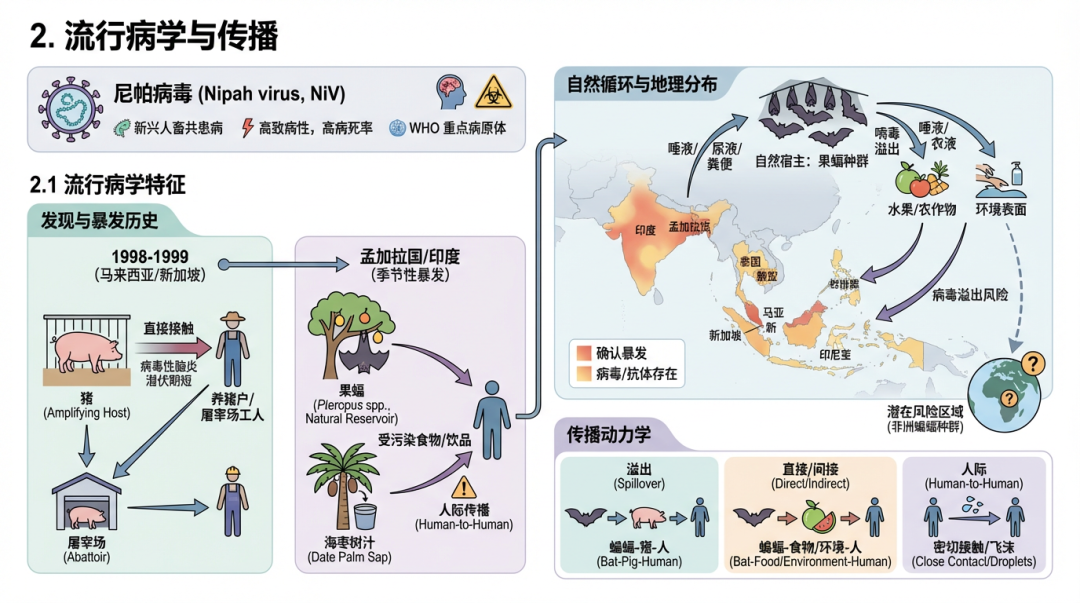 尼帕病毒(Nipah virus, NiV)是一种新兴的、高致病性的人畜共患副粘病毒,因其高病死率和人际传播潜力而被世界卫生组织(WHO)列为重点研究的病原体。本部分将详细阐述尼帕病毒的流行病学特征、自然循环和传播动力学。