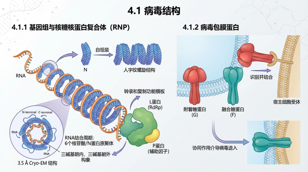 病毒基因组RNA被核蛋白(N)包裹形成核衣壳(RNP)。在这一过程中,P蛋白扮演着分子伴侣的角色,它与游离的N蛋白(N⁰)结合,阻止其自我聚合,并使其保持一种开放的构象,以便随时抓取并包被新合成的病毒RNA [69]。