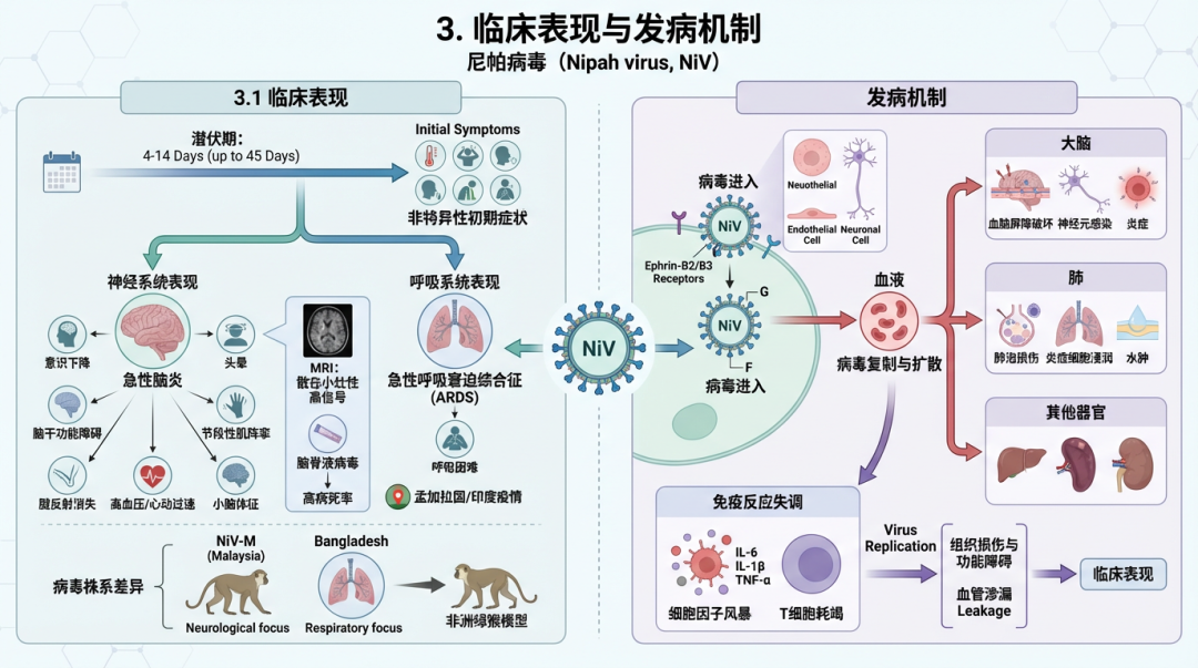 呼吸系统表现:急性呼吸窘迫综合征(ARDS)是另一个主要临床特征,尤其在孟加拉国和印度的疫情中更为常见 [14, 83]。不同病毒株系可能导至不同的临床偏重。在非洲绿猴模型中,与马来西亚株(NiV-M)相比,孟加拉国株(NiV-B)感染导至更高的病死率,并伴有更迅速的呼吸功能衰竭和全身性病毒播散 [80]。