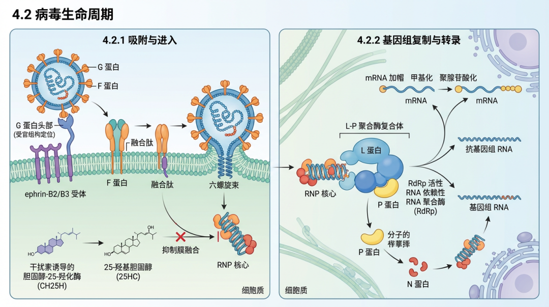 NiV的发病机制涉及病毒与宿主相互作用的多个层面,包括高效的细胞入侵、独特的病毒复制与组装策略,以及强大的免疫逃逸能力。