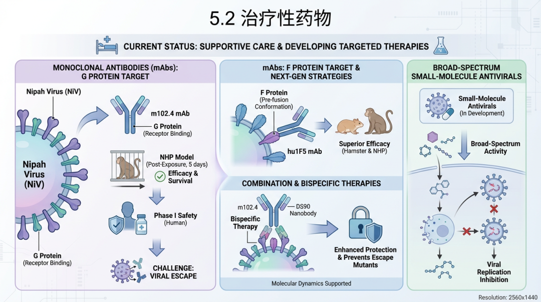 目前,尼帕病毒感染的治疗仍以支持性护理为主,但多种针对性治疗药物的研发正在积极进行中,主要包括单克隆抗体和广谱小分子抗病毒药物。