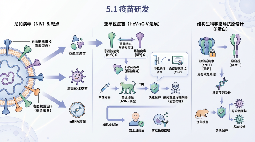 尼帕病毒的疫苗研发主要以其表面糖蛋白G(附着蛋白)和F(融合蛋白)为靶点,涵盖了亚单位疫苗、病毒载体疫苗和mRNA疫苗等多种技术路线。