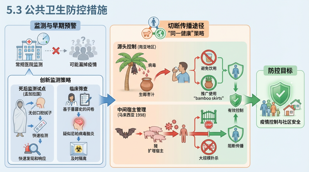 在缺乏有效疫苗和药物的情况下,强有力的公共卫生措施是控制尼帕病毒疫情的关键。这些措施包括加强监测、切断传播途径和管理社会心理影响。