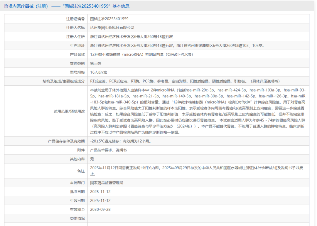 miRNA作为一类长度约18-25nt的非编码RNA,已成为精准诊断的理想分子标志物。miRNA的诊断价值集中体现为“无创性、高灵敏度、高特异性”,可覆盖肿瘤、感染性疾病、神经退行性疾病等多领域,弥补传统诊断手段的短板,实现疾病的早期识别与精准确诊。 miRNA在诊断与分型中的临床应用,依赖于精准的检测技术,目前主流技术包括荧光RT-PCR、数字PCR。其中荧光RT-PCR技术成熟、成本可控,广泛应用于临床常规检测(如晋百慧、命码生物的获证试剂盒)。数字PCR技术灵敏度更高,适用于低丰度miRNA检测(小海龟、新弈等企业)。 本文梳理了截至26年1月,在中国已获NMPA医疗器械注册证的miRNA试剂盒开发企业情况(Ⅲ类为主)。企业名称 | 产品名称 | 注册证号 | 获批时间 | 核心用途 | 技术路线 | 顿慧医疗(原上海骏实生物) | 7种微小核糖核酸检测试剂盒(PCR荧光探针法) | 国械注准20173403299 | 2022-02-09 | 肝细胞癌早诊与疗效监测 | 荧光RT-PCR | 江苏命码生物 | 微小核糖核酸(microRNA - 25)检测试剂盒(荧光PCR法) | 国械注准20153402055 | 2025-03-25 | 胰腺癌辅助诊断 | 荧光RT-PCR | 深圳市晋百慧生物 | miR - 92a检测试剂盒(荧光RT - PCR法) | 国械注准20183400108 | 2022-08-03 | 结直肠癌筛查 | 荧光RT-PCR | 康德(深圳)生物 | 4种微小核糖核酸检测试剂盒(PCR荧光探针法) | 国械注准20253401406 | 2025-07-17 | 疑似胰腺癌患者辅助诊断 | 荧光RT-PCR | 觅瑞(杭州)生物 | 12种微小核糖核酸(microRNA)检测试剂盒(荧光RT-PCR法) | 国械注准20253401959 | 2025-11-12 | 胃癌早筛(国内首个) | 核荧光RT-PCR |