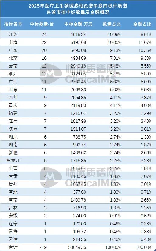 省份层面,采购量前十的省份为江苏、上海、广东、北京、云南、广西、浙江、山东、重庆、四川,合计占全国总量的66.67%。前十省份覆盖三大核心区域,且南方省份占据主导,进一步印证了我国临床质谱市场需求的区域集中度与经济医疗发展水平的强关联性。