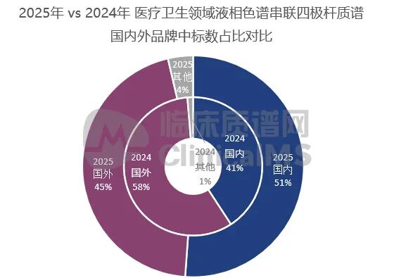 2024、2025医疗卫生领LC-MS/MS国内外品牌中标量占比,临床质谱网制图