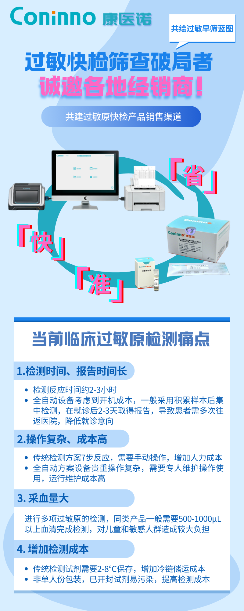 康医诺公司作为过敏原快检筛查领域的破局者,给广大易敏人群带来方便、快速、高通量的过敏原检测方案,现诚邀各医药经销商、IVD企业等志同道合的伙伴们,与康医诺共建过敏原快检产品销售渠道,共绘过敏早筛蓝图。