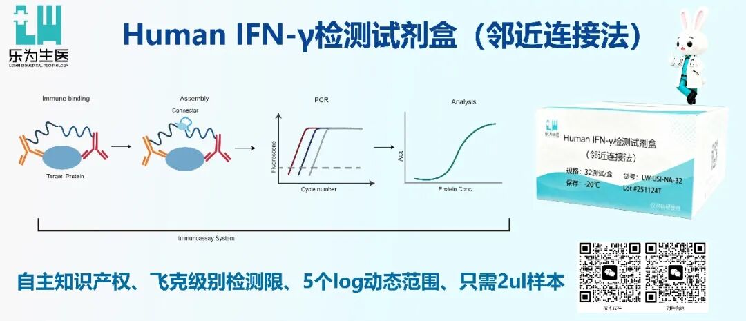 在细胞因子信号网络中,IFN-γ作为免疫调节的关键信使,其精准定量对科研探索至关重要。乐为生医全新推出的Human IFN-γ检测试剂盒(邻近连接法),正是基于前沿的邻近连接检测技术,将抗体识别的高特异性与核酸扩增的超高灵敏度完美结合,实现对血清、血浆及细胞上清中极低浓度IFN-γ的精准探测。