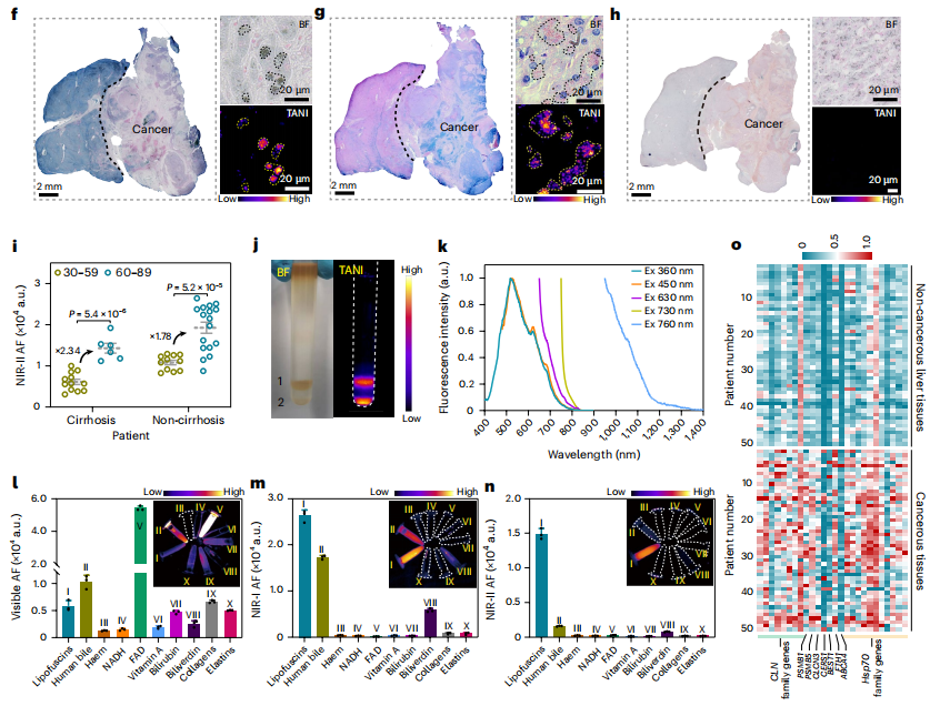作者还证实了肝细胞癌(HCC)的组织学分级、大小和肿瘤分期对 TANI 诊断能力都没有显著影响。不仅如此,TANI不仅适用于HCC,也成功地应用于肝内胆管癌(ICC)和各种肝转移癌(如结直肠癌肝转移CRLM、胃腺癌肝转移GACHM、乳腺癌肝转移BCLM)(图m-n)。