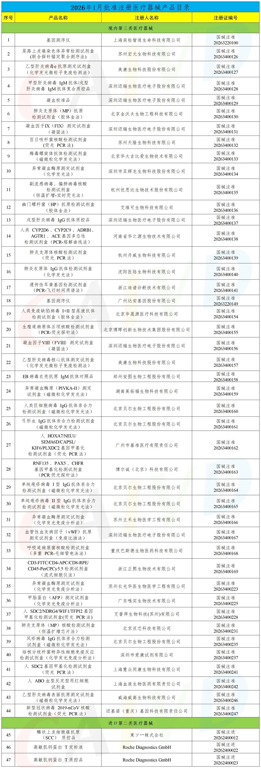 2026年1月,国家药监局共批准注册医疗器械产品292个。其中,境内第三类医疗器械产品251个,进口第三类医疗器械产品23个,进口第二类医疗器械产品15个,港澳台医疗器械产品3个(具体产品见附件)。其中,体外诊断产品47个。