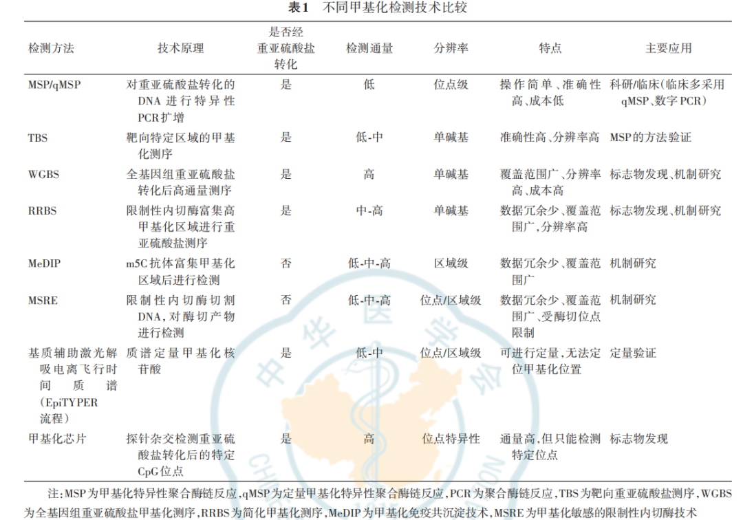【摘要】 随着个体化医疗的快速发展,血液游离 DNA(cfDNA)甲基化肿瘤标志物在临床诊疗中的重要性日益凸显,但其应用范围和实验室检测尚缺乏统一标准 。本专家共识参考最新研究发现,结合国内外临床实践,对血液 cfDNA 甲基化肿瘤标志物的基础理论、实验室检测以及临床应用等方面进行全面梳理,提出专家意见并深入讨论,形成检测应用的共识推荐 。本共识旨在为 cfDNA 甲基化这一新兴肿瘤标志物的临床实践提供参考,以提升临床相关人员对其重要性和适用性的认识,从而促进其在精准医学中的健康规范发展。 【关键词】 DNA 甲基化 ; 肿瘤 ; 生物学标记 ; 临床实验室技术 DNA 甲基化作为一种表观遗传调控机制,在基因表达调控中发挥重要作用,同时也是肿瘤发生发展的重要分子标志[1‑2]。肿瘤 DNA 甲基化标志物在肿瘤筛查、辅助诊断及预后评估等临床实践中展现出应用潜力 。随着液体活检的快速发展,采用体液分析个体的癌症分子特征成为热点 。血液标本取样便捷、存储方便,能够相对广泛地反映身体的生理病理状况,是临床检验应用最为广泛的标本类型。 基于血液游离 DNA(circulating free DNA, cfDNA)甲基化的肿瘤标志物,因其具有高灵敏性、非侵入性、可溯源、可动态监测等优势,在液体活检领域展现出广阔的应用前景[3]。 目前国内外针对血液 cfDNA 甲基化肿瘤标志物检测,尚未形成统一的临床应用规范与标准化检测体系,这在一定程度上制约了该技术在临床场景中的规范化推广与应用。 为提高临床对血液 cfDNA甲基化检测重要性的认识,促进该领域的标准化发展,中华医学会检验医学分会基于最新的研究发现和临床实践编写了本专家共识。该共识系统介绍血液cfDNA甲基化肿瘤标志物的基本概念、实验室检测技术以及临床应用等内容。由于目前已获得我国国家药品监督管理局(NationalMedical Products Administration,NMPA)批准的血液cfDNA甲基化标志物均基于聚合酶链反应(polymerasechainreaction,PCR)检测方法,故本共识的核心内容主要聚焦于基于PCR的cfDNA甲基化实验室检测。本共识旨在为临床医生及检测人员提供关于血液cfDNA甲基化肿瘤标志物检测及其临床应用的指导性建议,促进临床检测规范化,为肿瘤筛查、辅助诊断以及预后评估等临床应用提供依据。