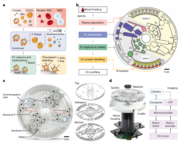 近日,来自美国和韩国的研究团队合作在杂志Nature Biomedical Engineering上发表了一篇题为“Automated disc device for multiplexed extracellular vesicle isolation and labelling from liquid biopsies in cancer diagnostics”的文章。作者设计了一种名为SpinEx的紧凑型圆盘设备,可自动分离全血样本中的EV并进行多重免疫标记。在一项初步临床研究中,SpinEx 处理的囊泡能够以90%的准确率和97%的特异性区分癌症样本和非癌症样本,并以96%的准确率对5种肿瘤类型进行分类。这些结果说明,SpinEx能够实现从血液中自动且多路处理EV,这可能有助于开发出临床上可行的癌症检测和分类检测方法。